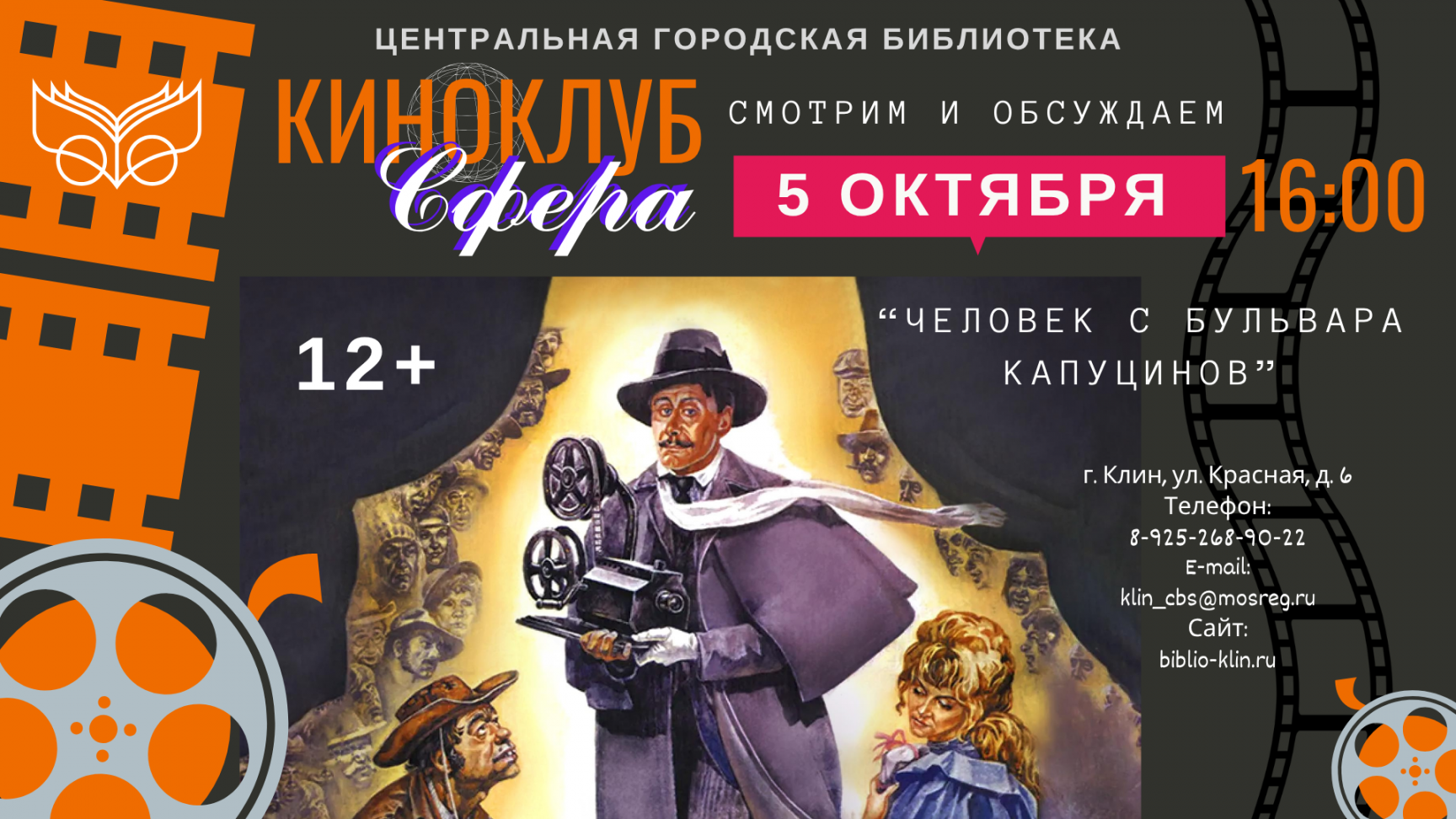 5 октября в 16:00 Центральная городская библиотека приглашает всех желающих на первую встречу участников киноклуба «Сфера». В этот день состоится просмотр и обсуждение известного советского фильма «Человек с бульвара Капуцинов», посвященного кинематографу. Мы будем крайне рады всем, кому интересно закапываться в глубину смыслов, давать разнообразные и неожиданные интерпретации, формулировать свое мнение и слушать точку зрения других. Всегда интересно посмотреть хорошее кино в приятной компании! Давайте вместе разбирать и анализировать умные и сложные киноленты! Встречи будут проходить два раза в месяц, в первое и третье воскресенье.