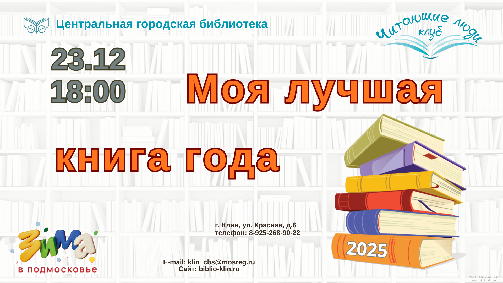 Из ваших впечатлений мы составим уникальный список «Топ-книг» 2025 года» от клуба «Читающие люди». Не стесняйтесь, если ваша книга года еще не найдена — приходите вдохновляться идеями! Приносите прочитанную вами книгу и обменяйтесь ею с другим участником. Ждём вас в Центральной городской библиотеке 23 декабря в 18:00. Вход свободный. Обязательны лишь хорошее настроение и желание говорить о книгах!