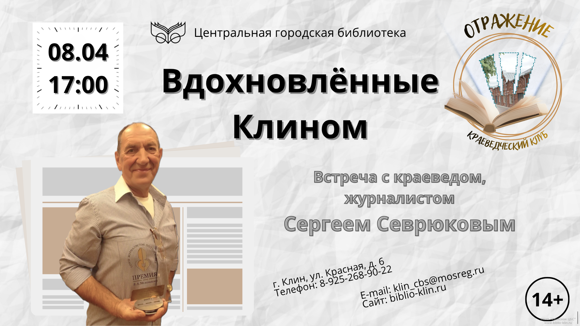 Трудовой путь С. Н. Севрюкова органично соединил в себе производственную деятельность и журналистику. Начав карьеру учеником слесаря, он прошел путь до начальника цеха на ведущем предприятии Клина — «Химволокно». Активно участвовал в издании газеты комбината «Заводская правда», где впоследствии возглавил ее редакцию. Далее профессиональная биография была связана с районной газетой «Серп и молот». С 2008 г. — учредитель и главный редактор издания «Наша Соборная площадь». За многолетний труд в сфере журналистики Сергей Николаевич удостоен ряда престижных наград. Он является очевидцем и летописцем ярких и важнейших событий историко-культурной жизни Клина и округа. Не пропустите встречу 8 апреля в 17.00 в библиотеке.