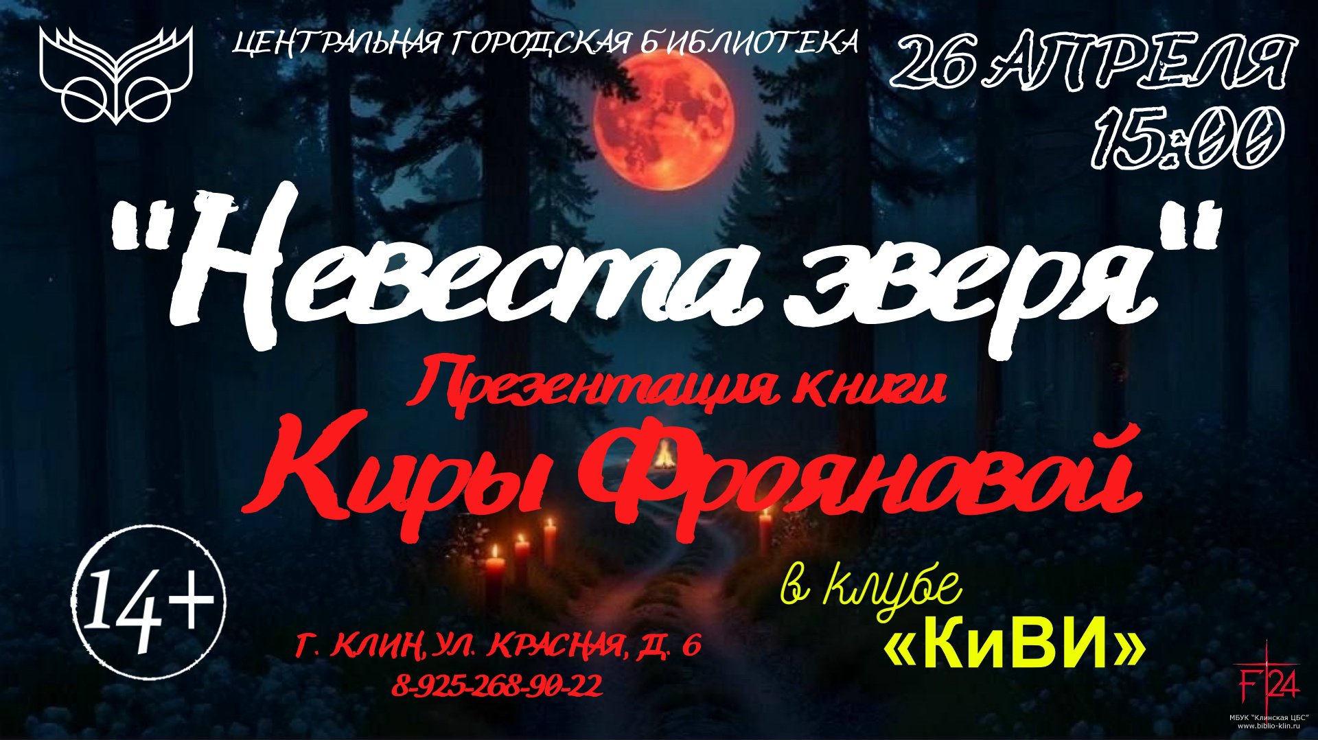 Центральная городская библиотека и клуб «КиВИ» приглашают 26 апреля в 15:00 на презентацию книги клинской писательницы Киры Фрояновой «Невеста зверя». Предлагаем погрузиться в атмосферу мистического фэнтези и фолк-хоррора, разобрать детали и узнать закулисные истории создания книги. Поговорим с автором о книгах, творчестве, увлечениях и пути в литературу. Не пропустите!