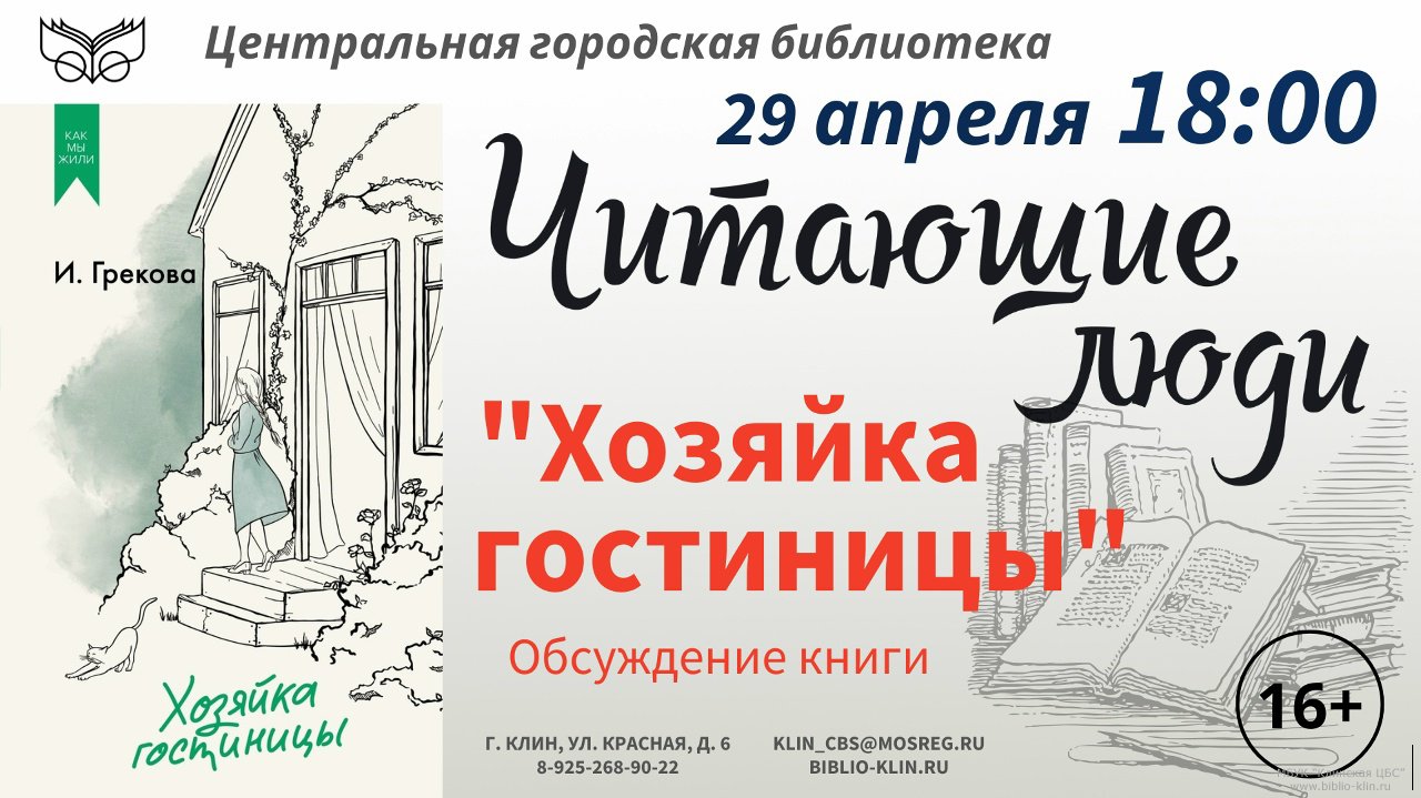 29 апреля в 18:00 в Центральной городской библиотеке состоится встреча литературного клуба «Читающие люди». В центре внимания участников окажется тонкая и глубокая повесть И. Грековой «Хозяйка гостиницы».