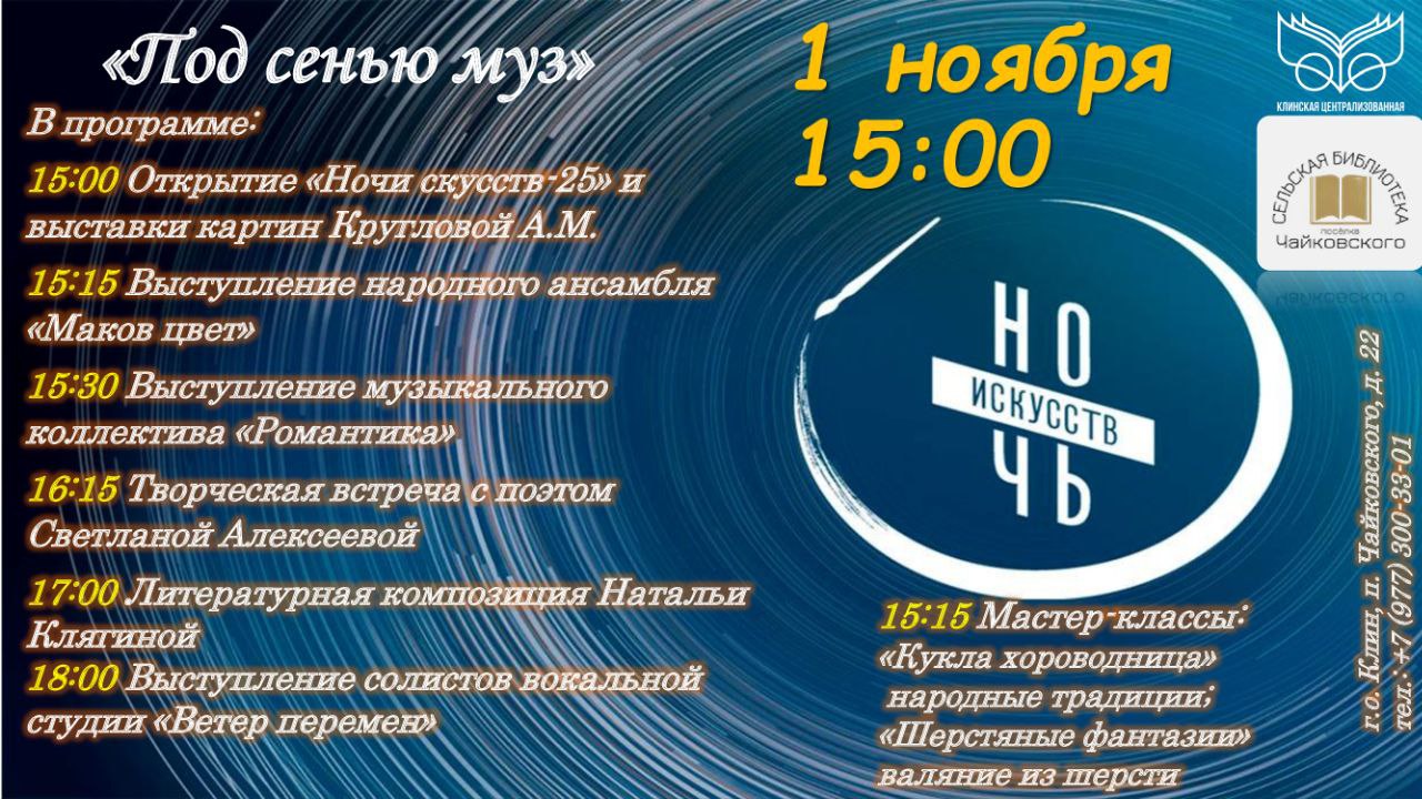 1 ноября в рамках ежегодной Всероссийской культурно-образовательной акции «НОЧЬ ИСКУССТВ – 2025» в модельной Сельской библиотеке п. Чайковского пройдет увлекательная программа, которая даст возможность всем желающим бесплатно посетить выставки, мастер-классы и литературные композиции, а также насладиться творческой встречей с поэтом Светланой Алексеевой и музыкальными номерами клинских артистов.