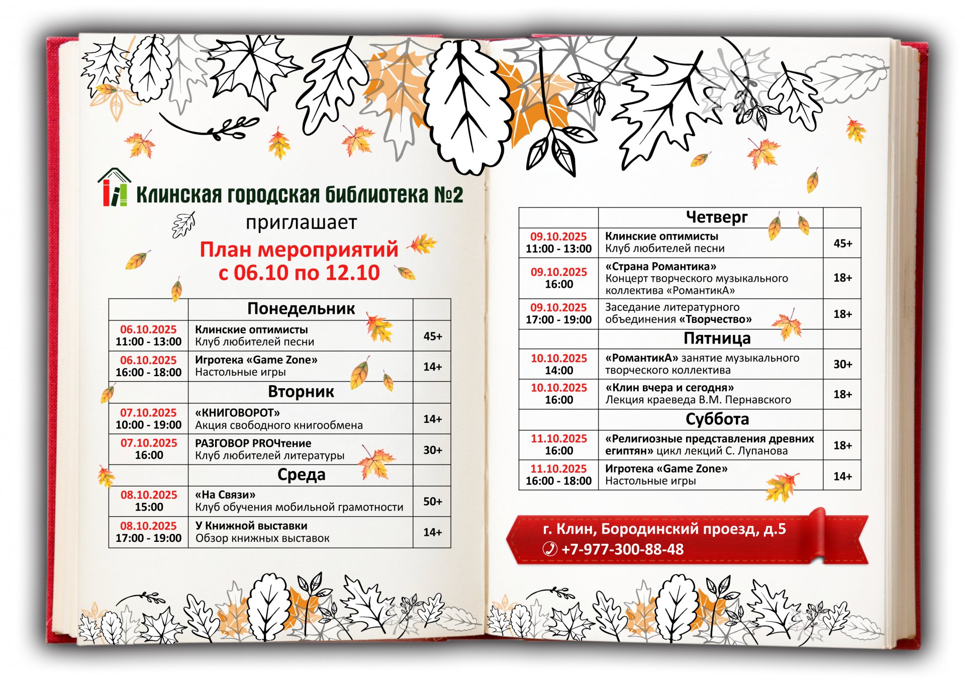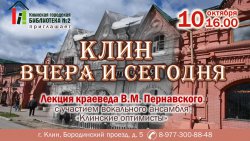 10 октября Клинская городская библиотека № 2 приглашает всех желающих на познавательную программу, в рамках которой краевед В.М. Пернавский прочитает лекцию «Клин вчера и сегодня», а артисты вокального ансамбля «Клинские оптимисты» порадуют зрителей музыкальными композициями.