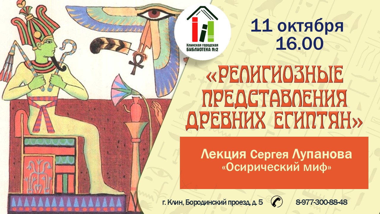11 октября в 16:00 в Клинской городской библиотеке № 2 состоится лекция С. Лупанова «Осирический миф» из цикла лекций «Религиозные представления древних египтян».