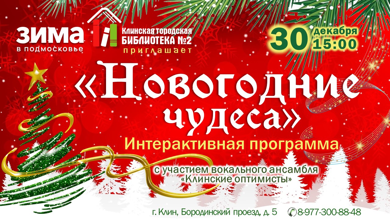25 декабря Клинская городская библиотека № 2 распахнула свои двери для читателей, пригласив их на волшебную предновогоднюю программу «Праздник к нам приходит…». Гостей ждали яркие выступления: музыкальный коллектив «РомантикА» подарил прекрасные мелодии, поэты ЛИТО «Творчество» очаровали прекрасными стихами, а дуэт «КаТим» в составе Елены Казмерчук и Евгения Тимофеева порадовал искромётным перфомансом.
