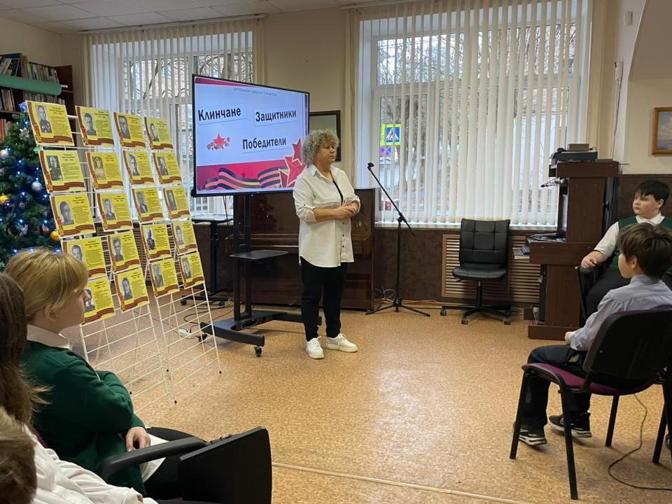 Краеведческая программа «Клинчане. Защитники. Победители», приуроченная к памятной дате — Дню Героев Отечества, прошла 5 декабря в Центральной городской библиотеке. Активное участие в ней приняли юные клинчане из гимназии им. В. И. Танеева. Они внимательно слушали рассказы ведущего и отвечали на вопросы о подвигах защитников Отечества, о клинчанах — Героях Советского Союза, получивших высокие звания в годы Великой Отечественной войны, о тружениках тыла, внесших свой вклад в дело Победы. Говорили об увековечивании памяти героев в Клину и округе. Гимназисты с особой гордостью называли улицы с именами клинчан-героев, на которых они проживают.