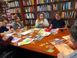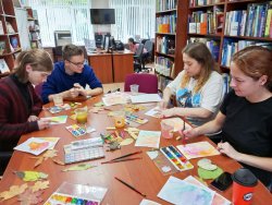 28 сентября в Центральной городской библиотеке все желающие смогли познакомиться с нетрадиционной техникой рисования фроттаж, в которой изображение воспроизводится путем натирания бумаги. Участники встречи складывали разнообразные композиции из осенних листьев, которые проявлялись на бумаге яркими цветами с помощью акварели и восковых карандашей.