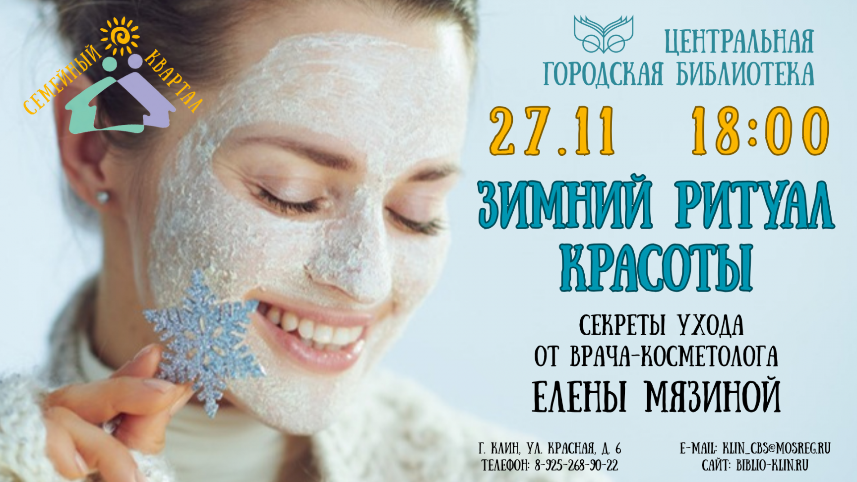 Центральная городская библиотека и клуб «Семейный квартал» приглашают всех желающих на встречу с врачом-косметологом Еленой Мязиной. В уютной атмосфере мы поговорим о том, как создать свой идеальный «зимний ритуал красоты», поможем нашим читателям открыть для себя мир современных технологий и передовых методик в области ухода за кожей.