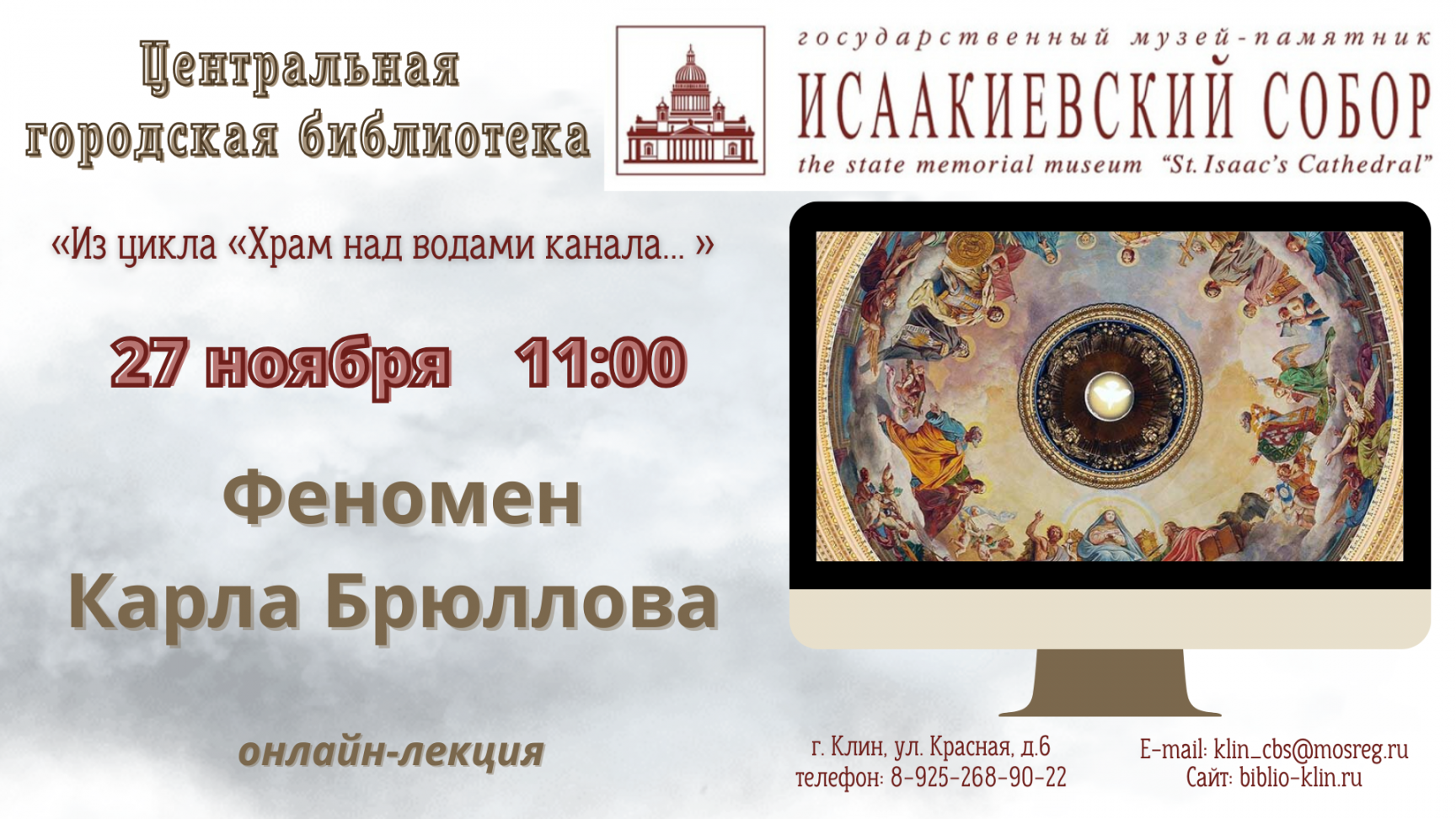 Государственный музей «Исаакиевский собор» приглашает всех желающих на онлайн-встречу, посвященную 225-летию со дня рождения великого художника середины XIX века Карла Павловича Брюллова.