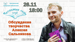 Дорогие друзья! Клуб «Читающие люди» Центральной городской библиотеки приглашает всех желающих на встречу, посвященную творчеству Алексея Сальникова, одного из самых ярких, неоднозначных авторов современной российской прозы! Алексей Сальников – лауреат премии им. П.П. Бажова, премий «Национальный бестселлер», «Новые горизонты» и «Большая книга». Он создал удивительный мир, где причудливо переплетаются быт и магия, обыденность и абсурд. В фокусе нашего вечера его культовые произведения: «Петровы в гриппе и вокруг него», «Опосредованно» и «Оккульттрегер».