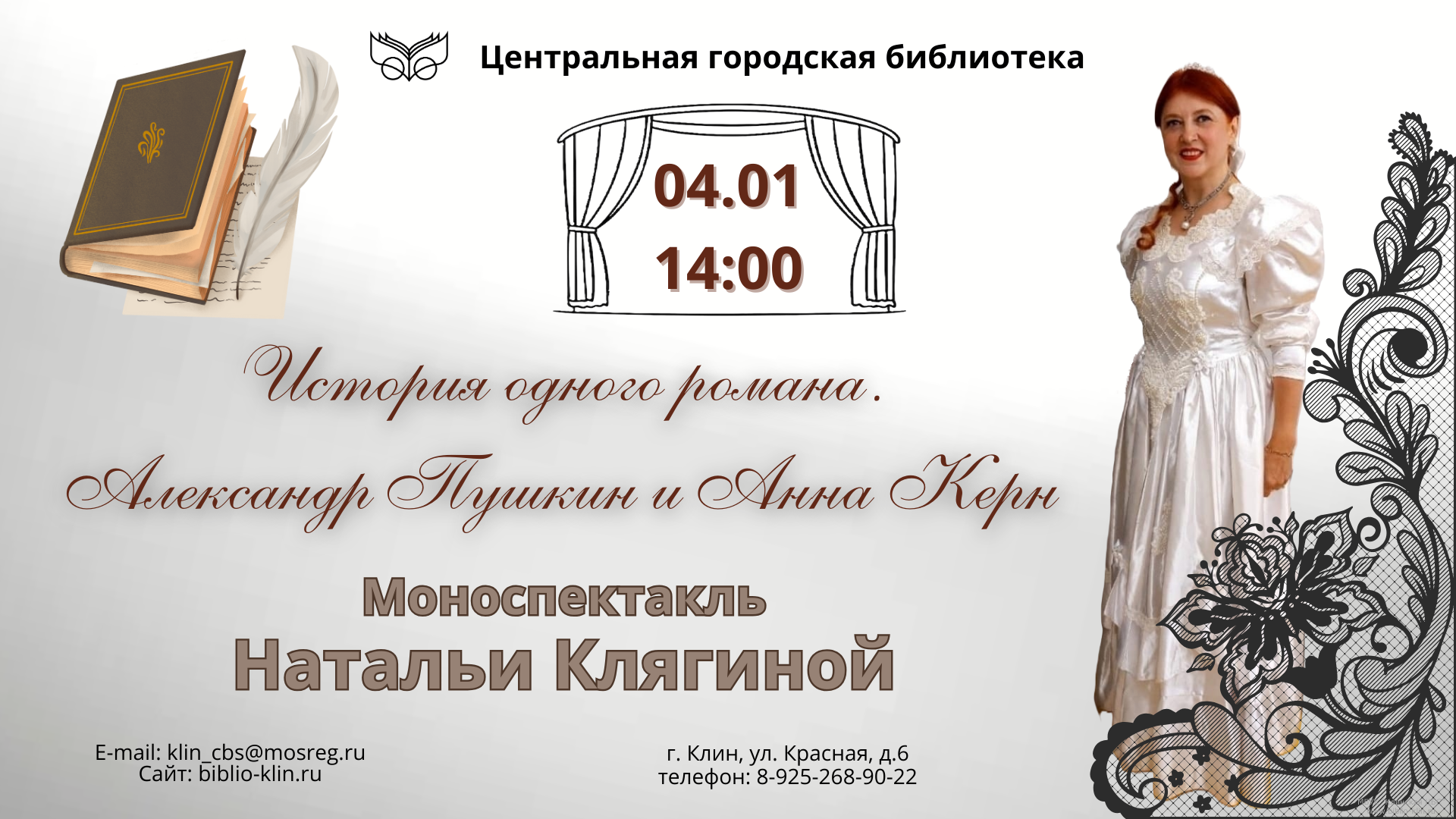 Моноспектакль Натальи Клягиной интересен именно этим, необычным углом зрения на жизнь Александра Сергеевича, ведь его основу составляют воспоминания незаурядной современницы Пушкина — Анны Петровны Керн. Той самой Керн, которой посвящены чудесные строки: «Я помню чудное мгновенье». Но ей ли они посвящены на самом деле? Факт этот до сих пор вызывает сомнения. Но не будем забегать слишком далеко, приходите на спектакль, разберёмся вместе.