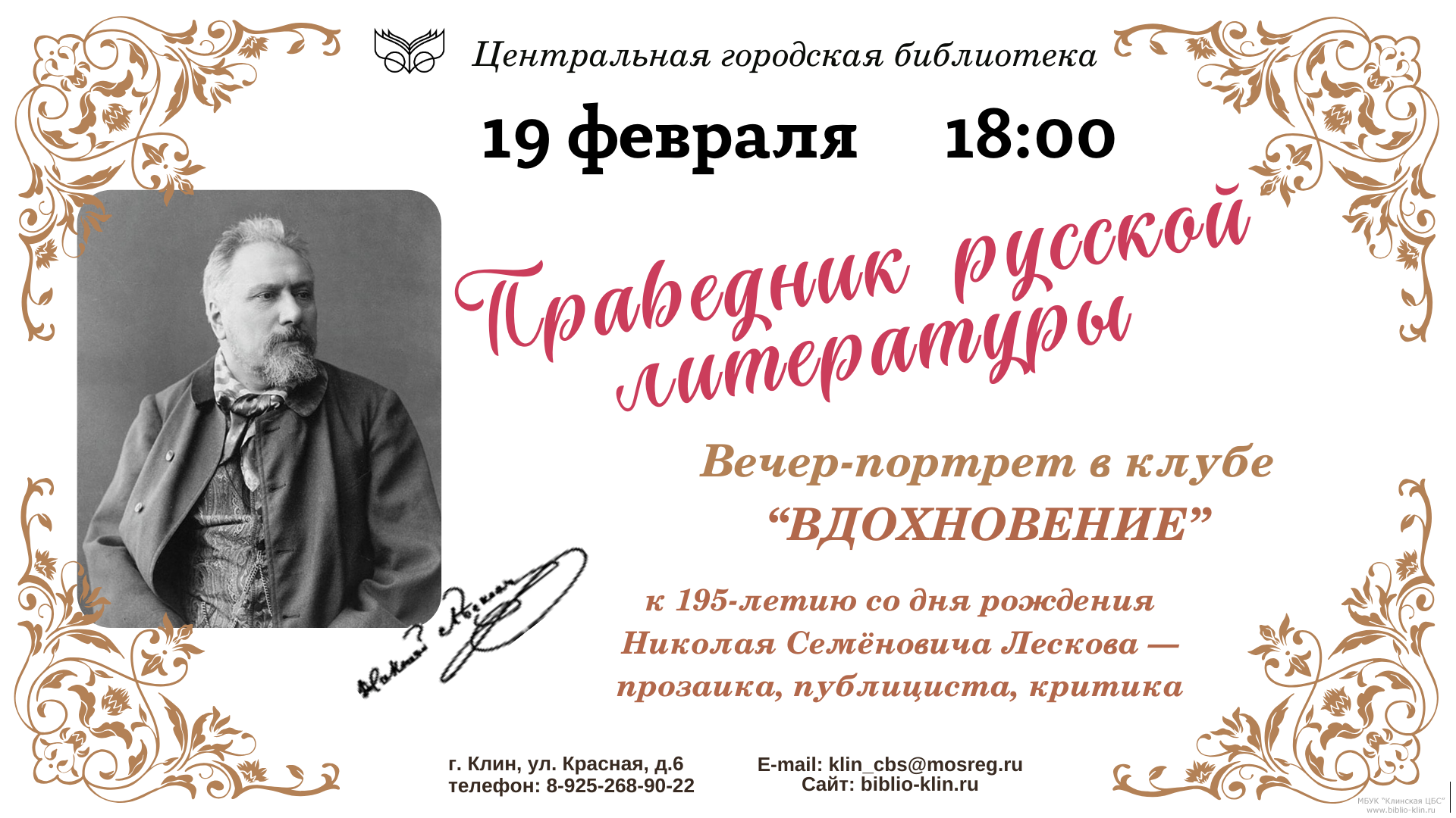 19 февраля в клубе «Вдохновение» в Центральной городской библиотеке состоится вечер-портрет, посвящённый 195-летию со дня рождения прозаика, публициста, критика Николая Семёновича Лескова. Мы подробно познакомимся с биографией писателя, обсудим его репутационный портрет и творческий путь, а также уделим внимание героям-праведникам, которые занимают особое место в его произведениях. Кроме того, присутствующие смогут увидеть фрагменты из экранизаций известных произведений Лескова. Приглашаем всех ценителей русской литературы провести вечер в атмосфере глубокого погружения в мир одного из самых ярких мастеров слова XIX века.