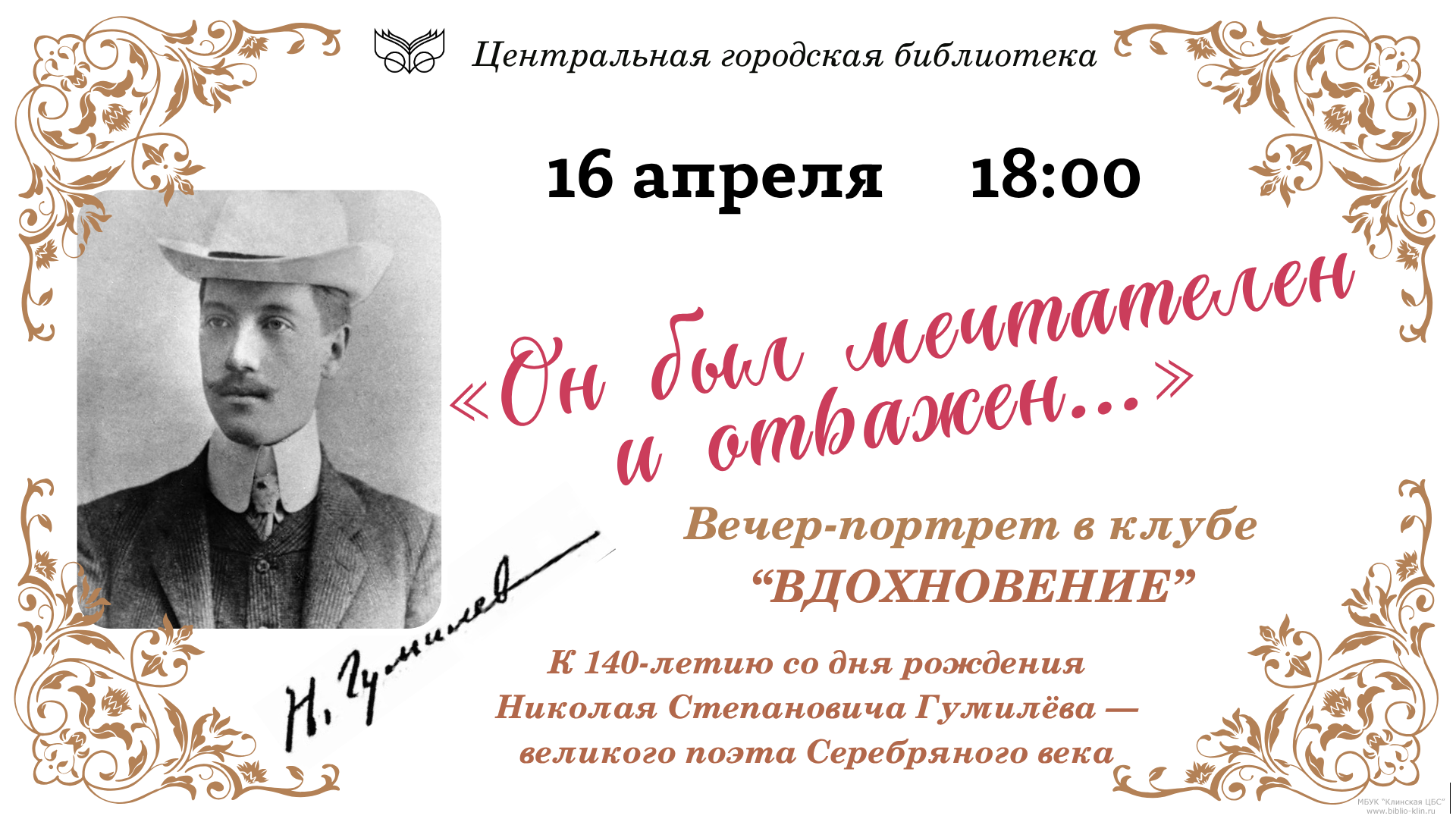 Центральная городская библиотека приглашает 16 апреля в 18:00 в клуб «Вдохновение» на вечер «Он был мечтателен и отважен», посвященный 140-летию со дня рождения великого поэта Серебряного века, путешественника, воина-офицера и дважды георгиевского кавалера Николая Степановича Гумилёва.