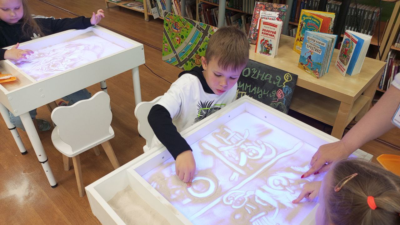 5 октября в Центральной детской библиотеке им. А.П. Гайдара прошло литературно-игровое мероприятие «Буратино в стране чудес», организованное в рамках работы клуба песочной анимации «Живые страницы». Сегодня юные читатели погрузились в мир сказки «Золотой ключик, или Приключения Буратино» Алексея Толстого.