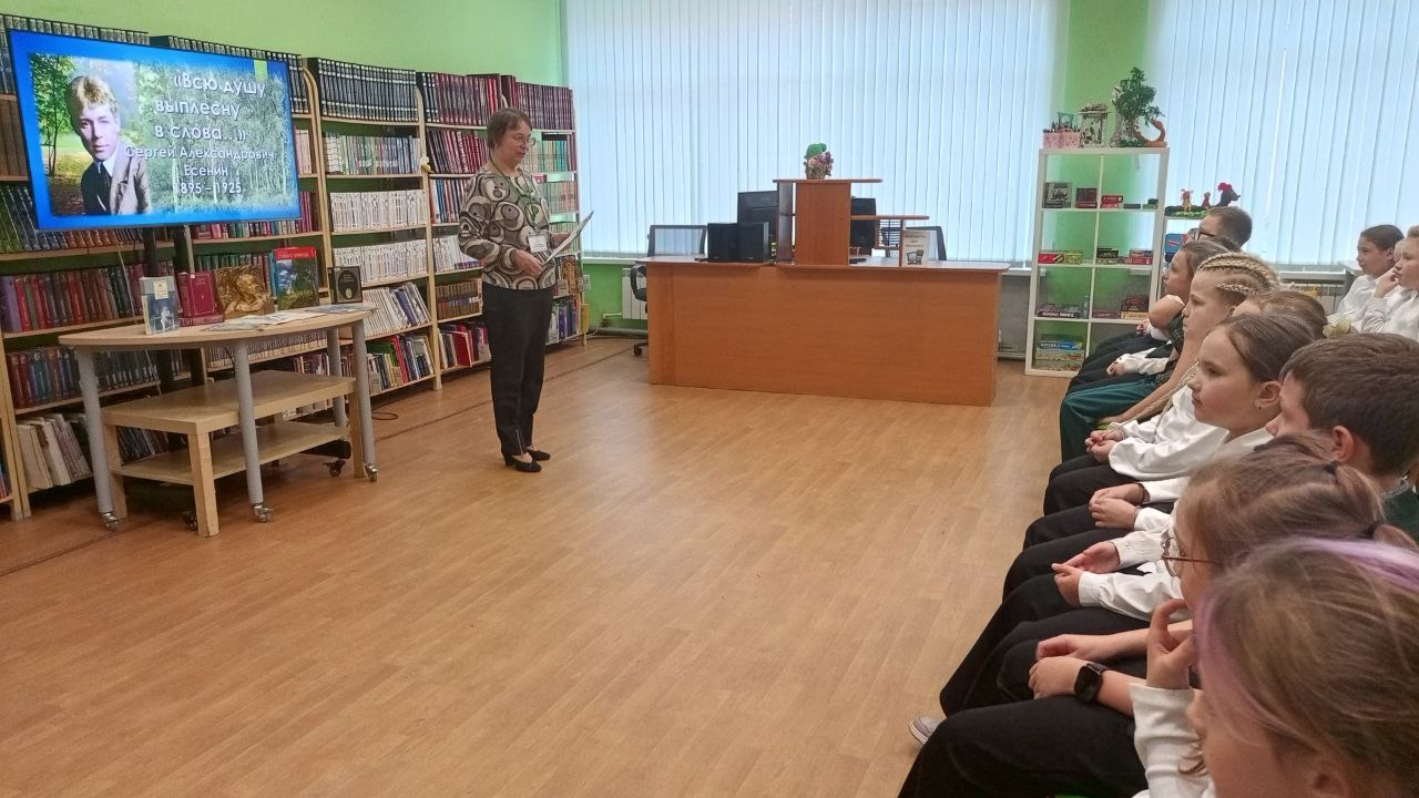 14 октября в Центральной детской библиотеке имени А. П. Гайдара собрались учащиеся 4 «Б» класса гимназии имени В. Н. Татищева. Повод был особенный – 130-летие со дня рождения великого русского поэта Сергея Есенина. Для юных читателей было подготовлено литературно-познавательное мероприятие под названием «Всю душу выплещу в слова...». Ребята с интересом узнали о жизни Сергея Есенина, о том, как рано он начал создавать свои стихи, и о его блестящем окончании Спас-Клепиковской школы, где он учился только на отлично.