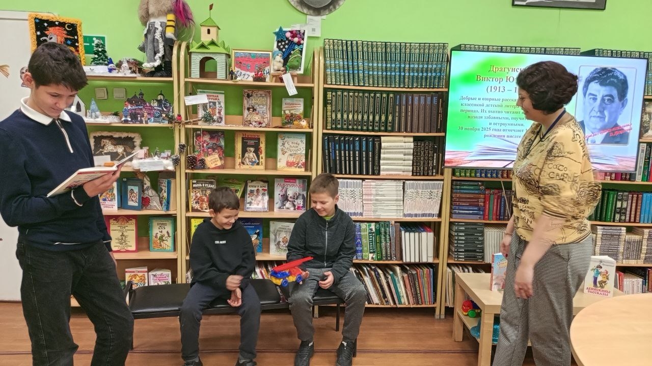 Юные читатели библиотеки с увлечением слушали удивительные истории из жизни автора, а затем погрузились в мир его замечательных произведений, познакомившись с новыми рассказами из цикла «Денискины рассказы». Но самое интересное ждало впереди! Ребята с азартом разыграли небольшую сценку по рассказу «Он живой и светится», где каждый смог почувствовать себя настоящим артистом или даже самим автором.