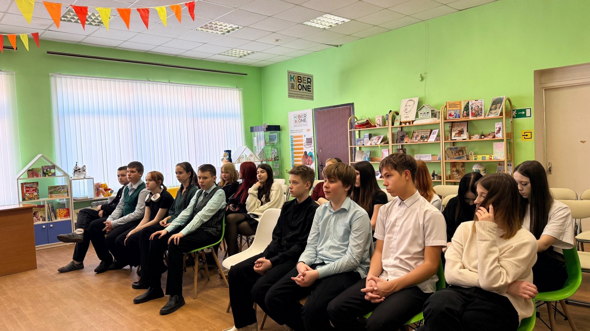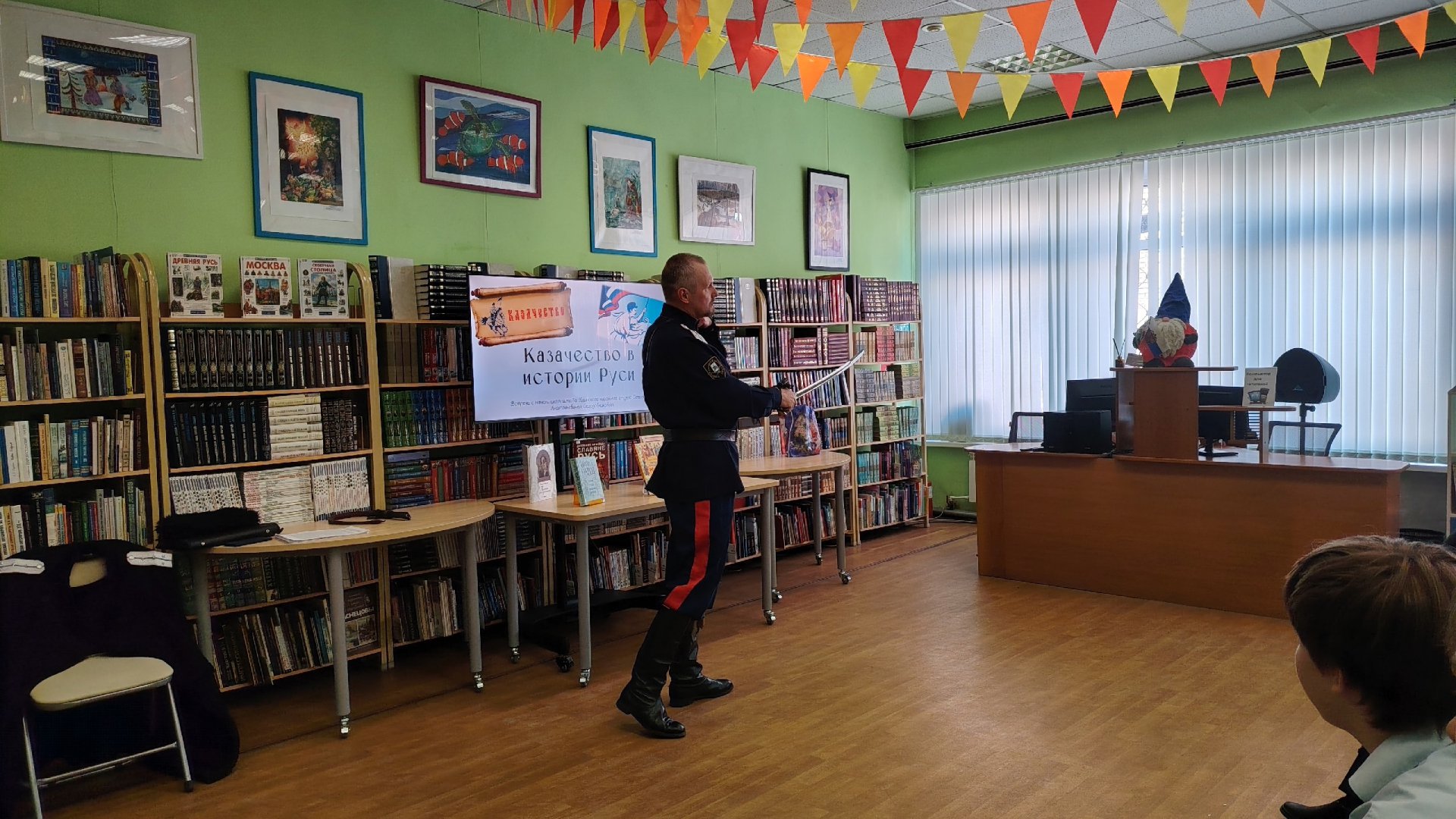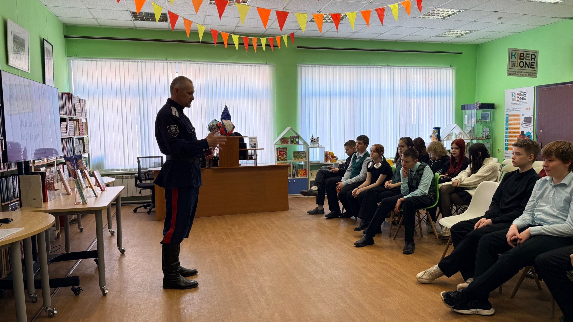 20 марта в Центральной детской библиотеке им. А. П. Гайдара собрались восьмиклассники гимназии им. В. Н. Татищева на встрече с Сергеем Анатольевичем Солодовниковым — начальником штаба Клинского казачьего отдела.