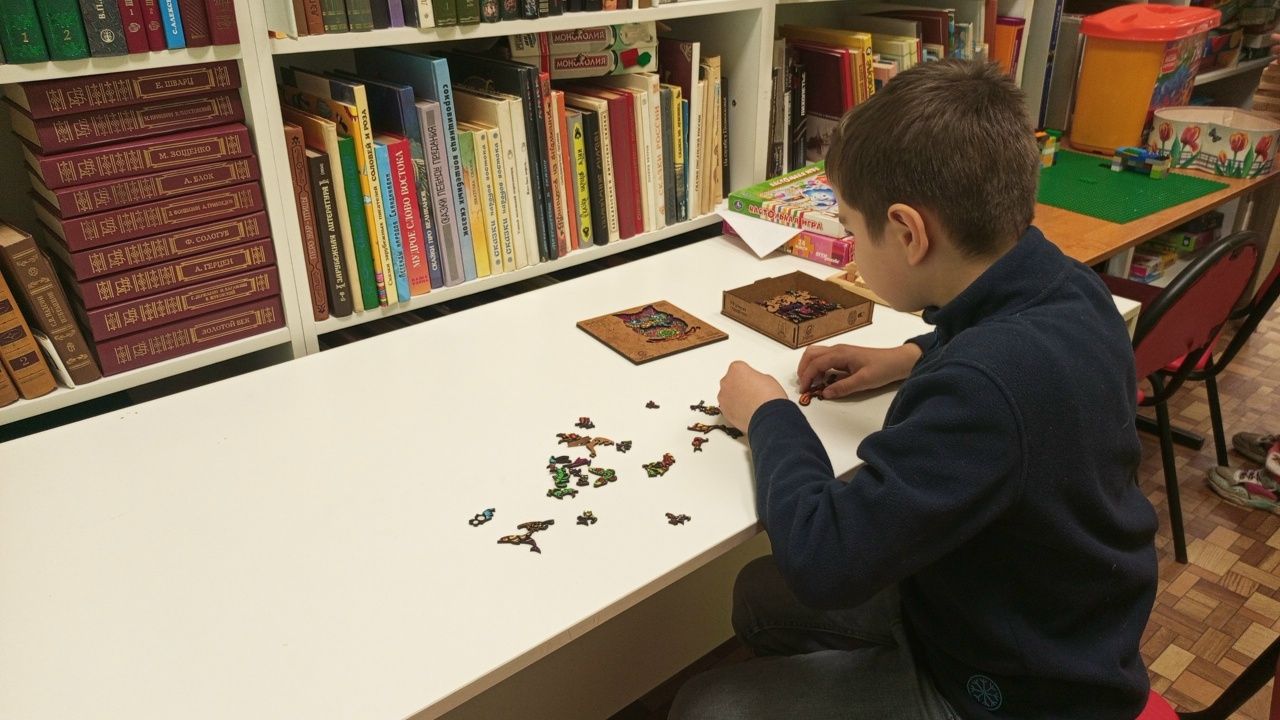 Кроме того, ребята с увлечением собирали деревянный пазл. Процесс требовал терпения и усидчивости: участники внимательно изучали фрагменты, искали подходящие сочетания и постепенно воссоздавали цельную картину.