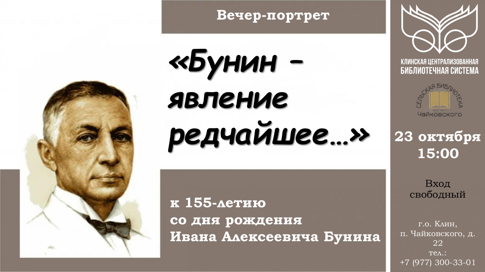 Приглашаем 23 октября в 15:00 погрузиться в удивительный мир творчества Ивана Алексеевича Бунина, выдающегося русского писателя лауреата Нобелевской премии по литературе, чье творчество поражает своей глубиной и искренностью!