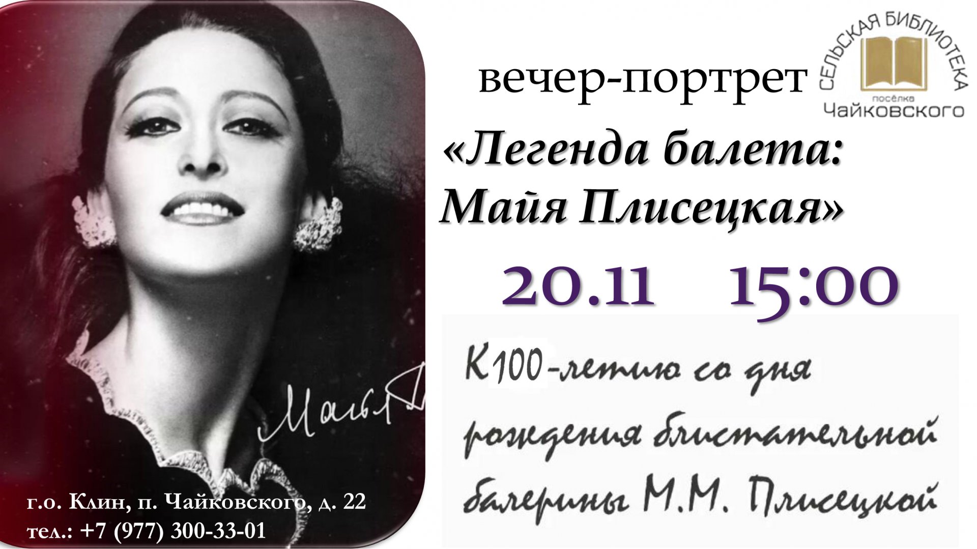 К 100-летию со дня рождения Майи Плисецкой в Сельской библиотеке п. Чайковского пройдет вечер-портрет. Участники вечера познакомятся с биографией балерины, удивительной женщины неповторимой судьбы, ставшей символом русского балета, узнают о ее неповторимом стиле и выдающихся ролях, покоривших зрителей по всему миру, а также посмотрят отрывки из балетов «Лебединое озеро», «Кармен-сюита», «Болеро» и другие балетные постановки, в которых Майя Михайловна блистала в сольных партиях.