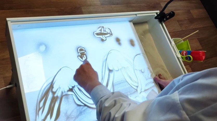 Своими руками ребята создавали открытки — настоящие послания, полные гордости и признательности. На песчаных холстах расцветали силуэты отважных героев, грозные танки, величественные звезды — всё то, что ассоциируется с мужеством и силой. Строгие образы из невесомых песчинок сменились игривым солнцем, символизируя конец зимы и долгожданное наступление весны.