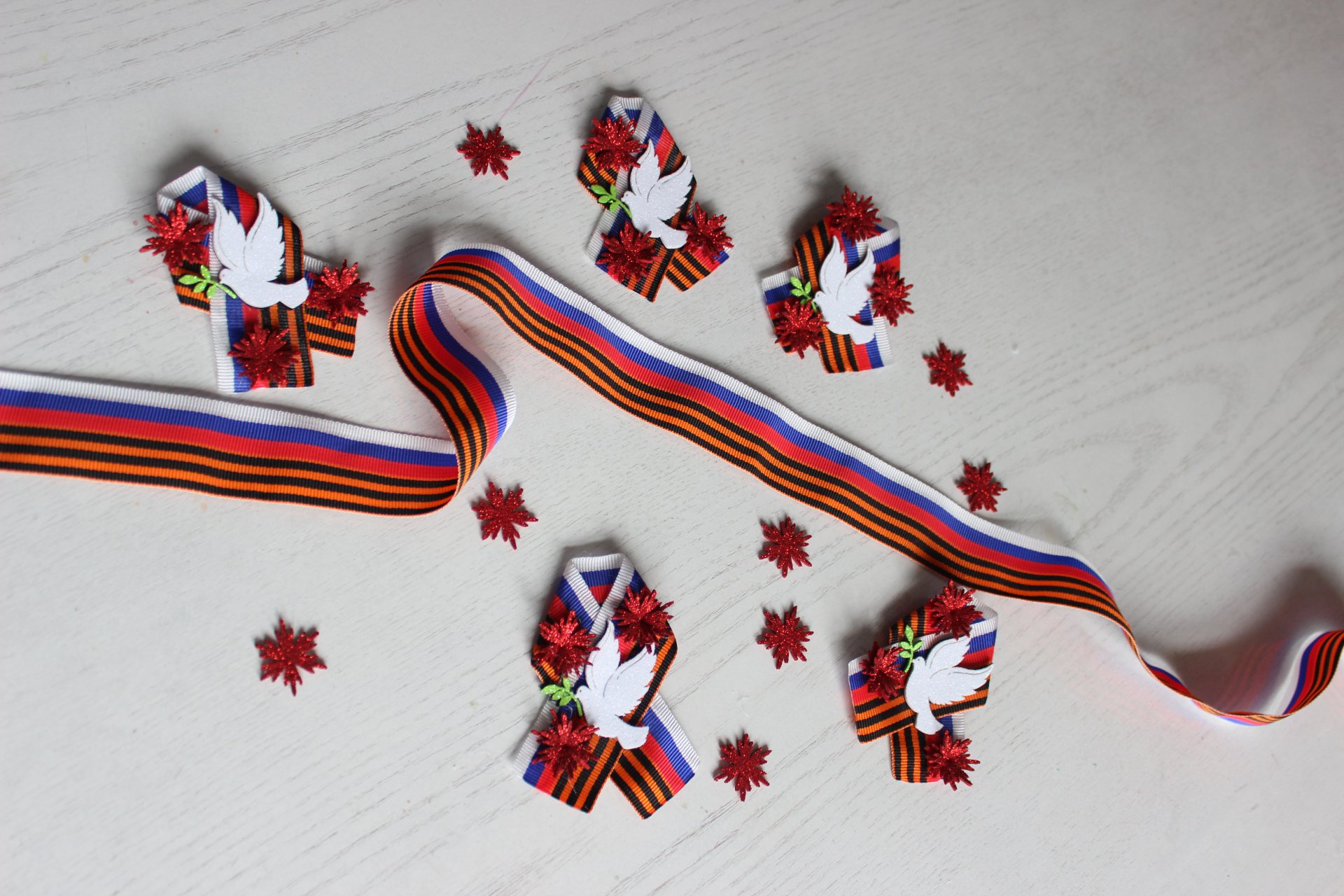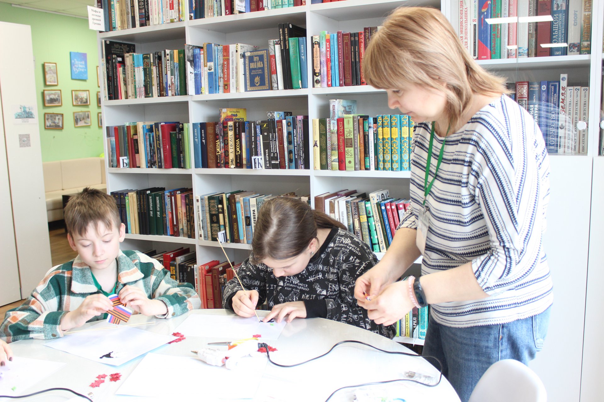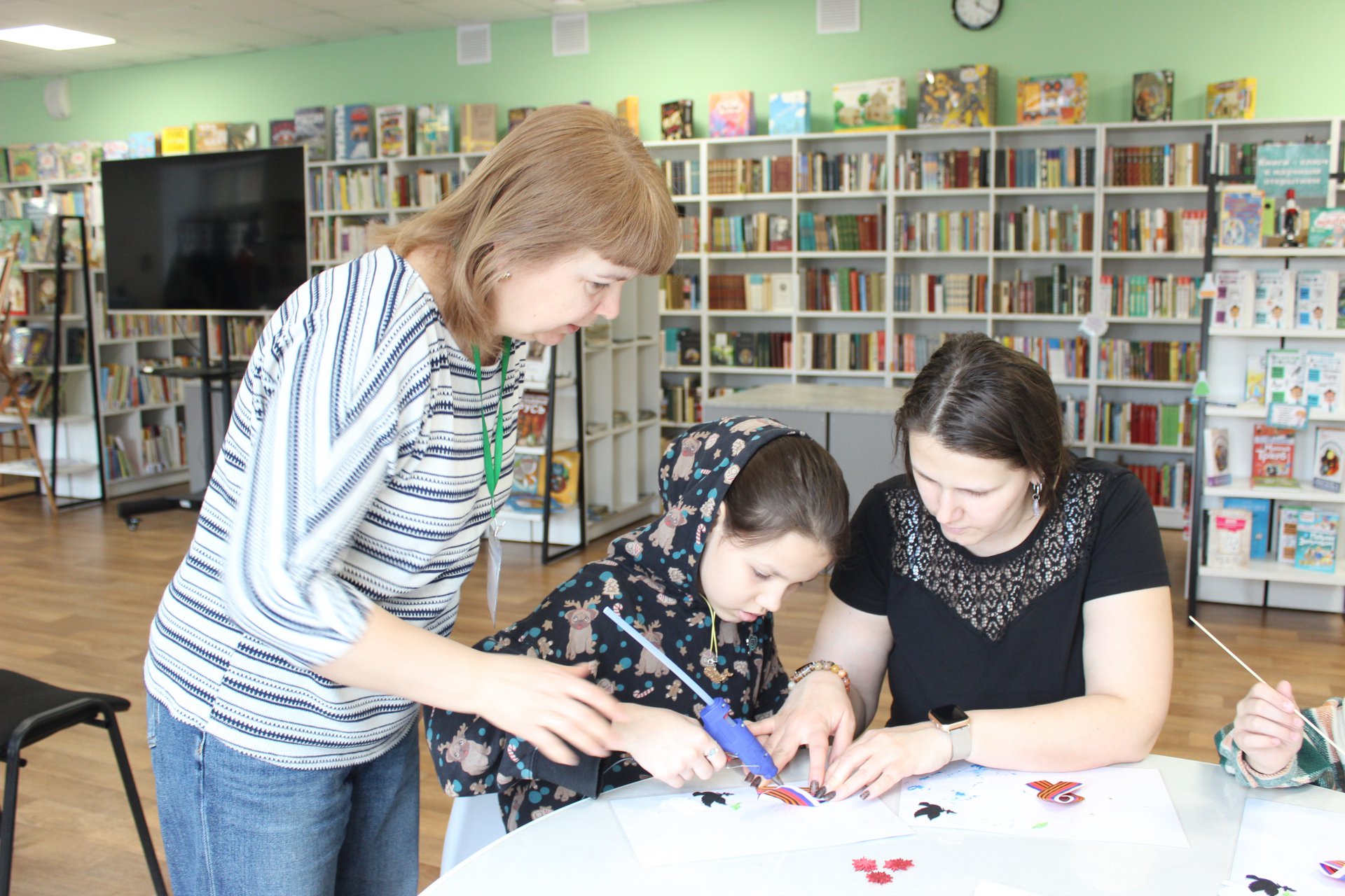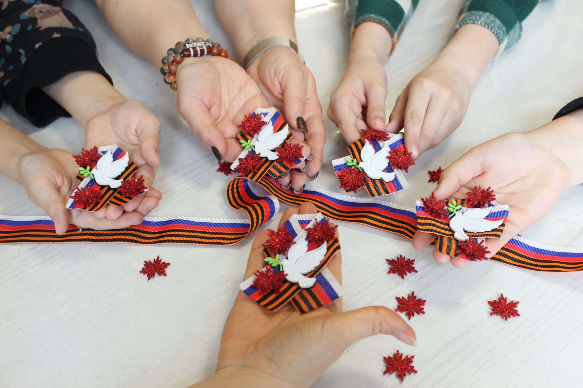 18 апреля в модельной Клинской детской библиотеке № 2 прошёл увлекательный мастер-класс «Брошь Победы», приуроченный к приближающемуся Дню Победы. Юные читатели и их родители с энтузиазмом создавали символические украшения. В основе каждой броши — элементы, напоминающие о подвиге наших предков: георгиевская лента, нежные голуби из фоамирана, символизирующие мир, и красные гвоздики — символ героизма, военной славы и памяти о погибших. Присутствующие с удовольствием учились работать с материалами, аккуратно вырезая детали, складывая ленты и собирая композиции.