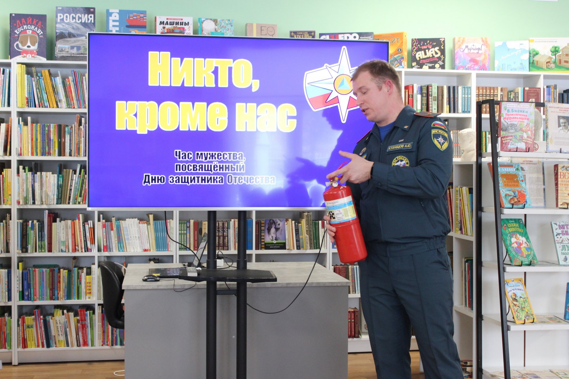 19 февраля в модельной Клинской детской библиотеке № 2 для восьмиклассников лицея им. Д. И. Менделеева состоялся час мужества «Никто кроме нас», посвящённый Дню защитника Отечества. Почётным гостем мероприятия стал сотрудник МЧС России — Кузнецов А. Ю., руководитель пожарной смены специальной пожарной части № 37, отряда Федеральной противопожарной службы № 13 Московской области, и его коллеги.