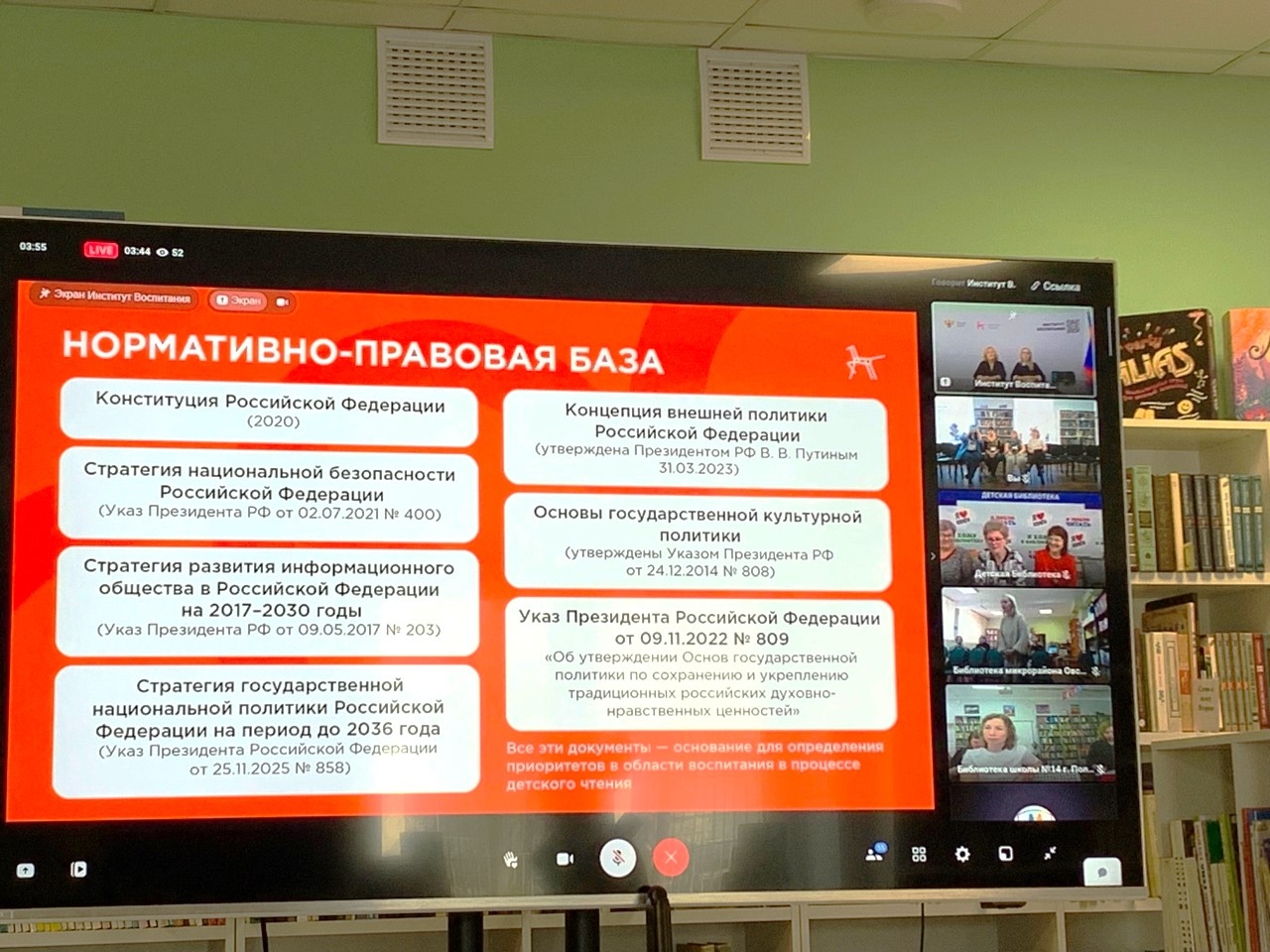 Ольга Петровна Демидова обратила внимание коллег на ключевые нормативно-правовые акты, актуальные данные исследований детского и подросткового чтения, а также на роль традиционных ценностей в библиотечной и педагогической практике.