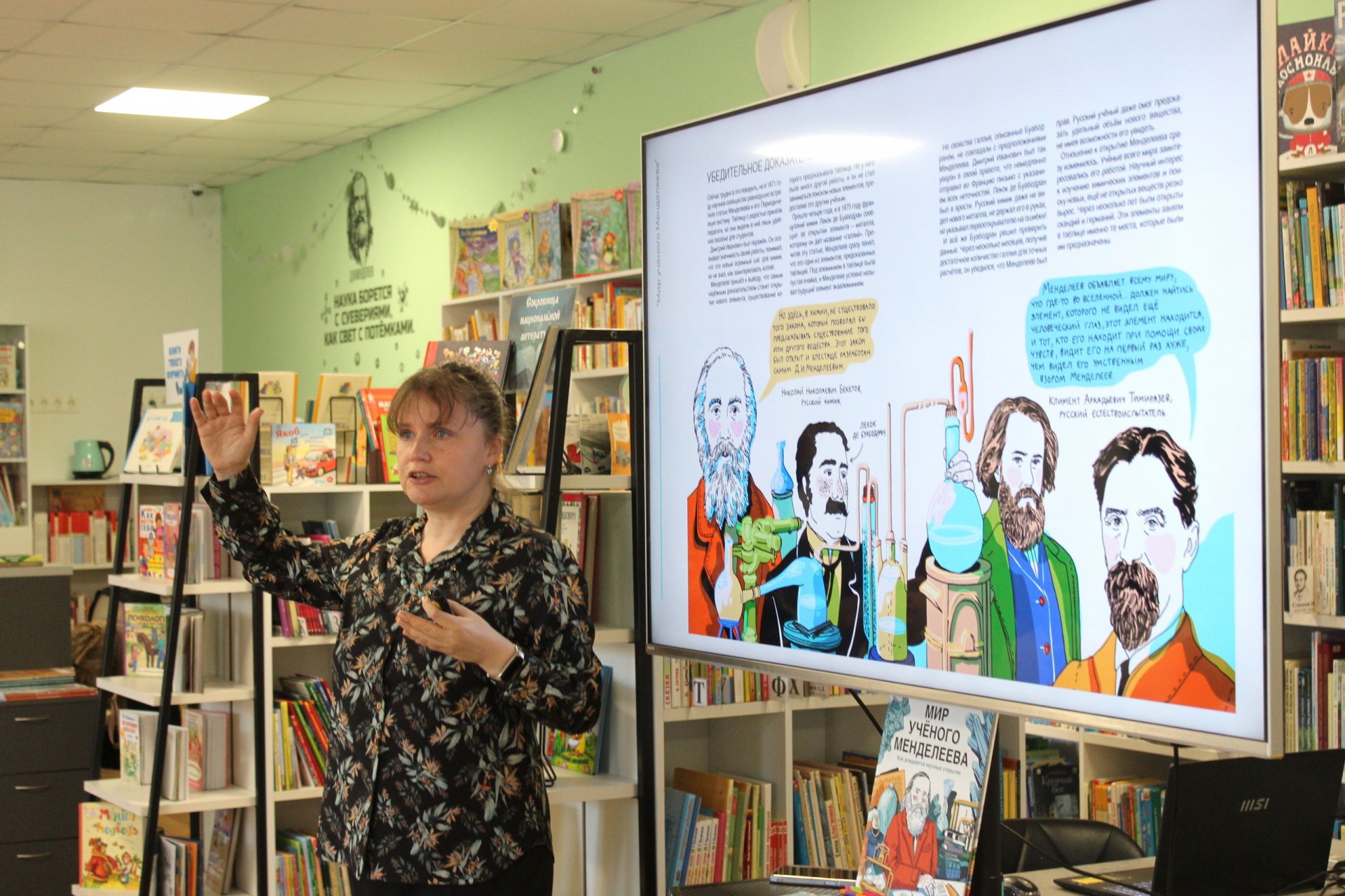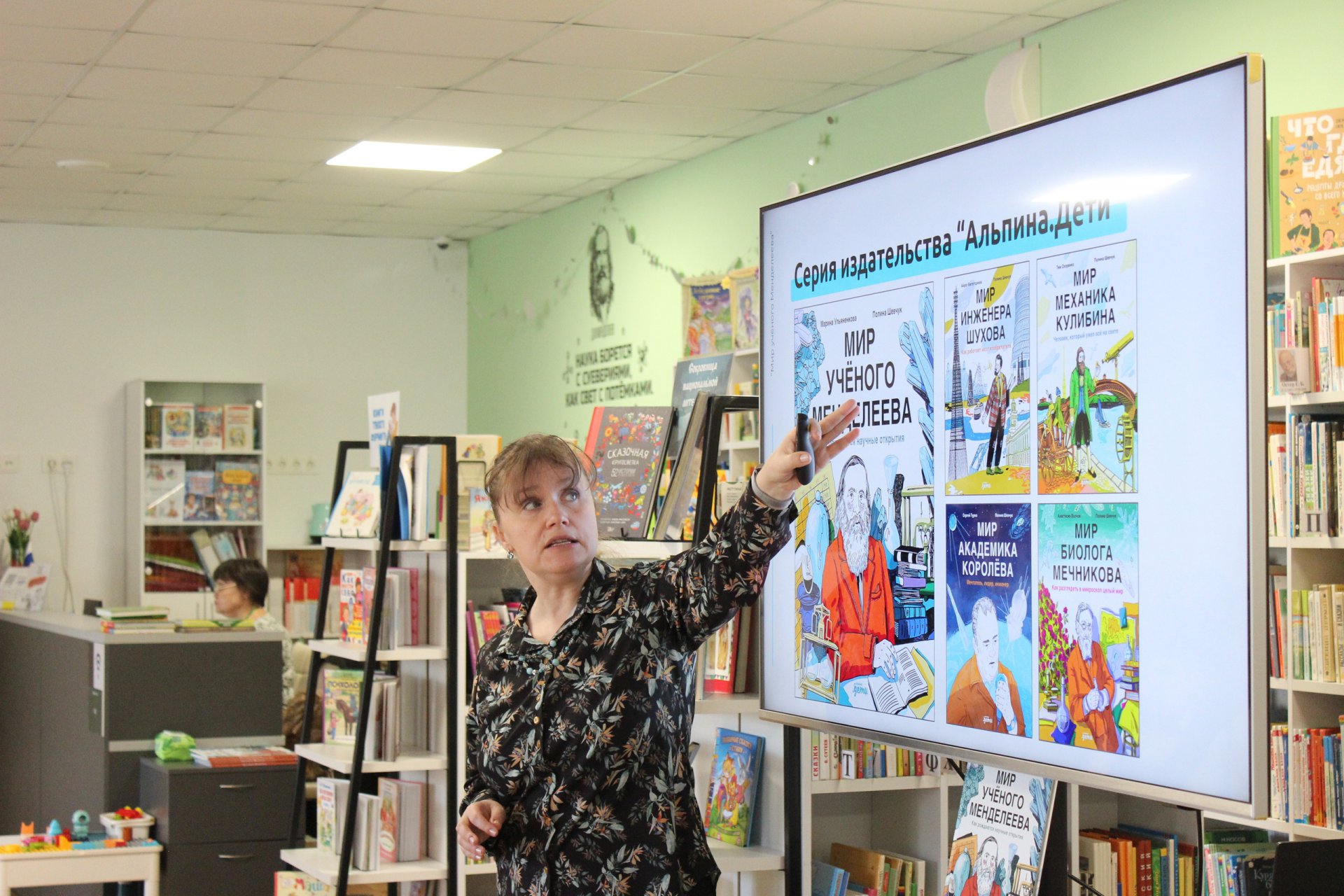 Особый интерес у мальчишек и девчонок вызвал рассказ автора о серии «МИРЫ», которую выпускает издательство «Альпина.Дети». Каждый том посвящён выдающимся людям, которые изменили наш мир, — учёным и изобретателям, чьи открытия навсегда перевернули наше представление о науке и технологиях. Книги адресованы юным читателям от 9 лет — тем, кто увлекается биографиями, хочет заглянуть за кулисы великих свершений и понять, как устроен мир вокруг нас. Каждый экземпляр становится результатом кропотливой работы. Писательница поделилась секретами, как она изучает документы, чтобы показать юным читателям не просто сухие факты биографии, а живого человека — с его увлечениями, преодолением трудностей и, конечно, великими свершениями. Отдельно Марина Сергеевна отметила красочные иллюстрации книги «Мир ученого Менделеева», созданные художницей Полиной Шевчук: благодаря её рисункам образ великого учёного становится по-настоящему близким и живым для наших читателей.