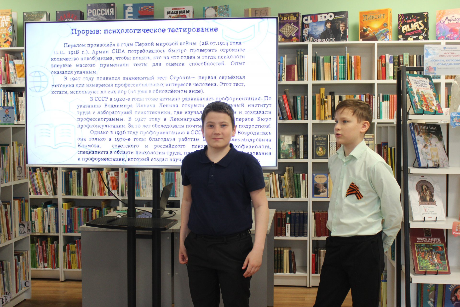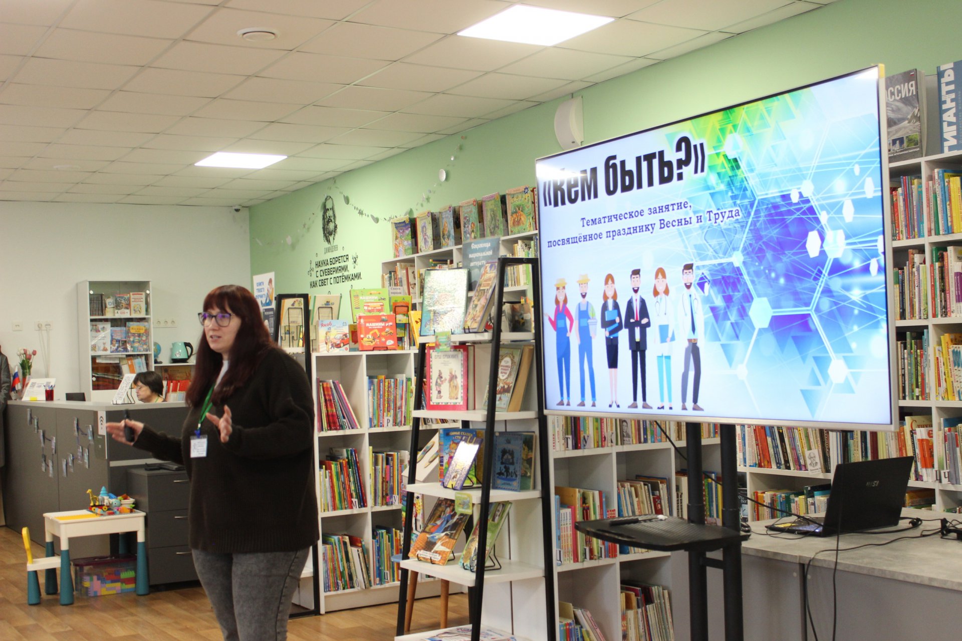 27 апреля в модельной Клинской детской библиотеке № 2 для учеников 6 «Т» и 7 «З» классов лицея им. Д. И. Менделеева прошло тематическое профориентационное занятие «Кем быть?», посвящённое Празднику весны и труда. Ребята узнали о специальностях, которые были востребованы много лет назад, об актуальных профессиях нашего времени, а также о направлениях, возникших на стыке науки, техники и творчества несколько лет назад. Особое внимание было уделено предрасположенностям детей, их планам и идеям. Подростки учились искать ответы на непростые вопросы: на что стоит обращать особое внимание при выборе профессии, как прислушиваться к своим желаниям, а не ориентироваться на мнение окружающих, какие личные качества действительно пригодятся в той или иной профессии... Занятие прошло в непринуждённой атмосфере.