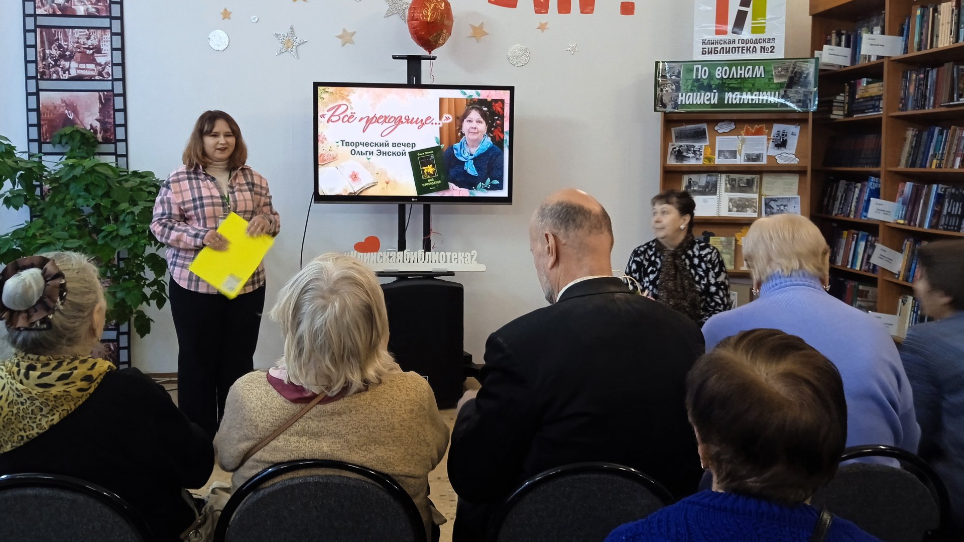 15 ноября в Клинской городской библиотеке № 2 прошел творческий вечер Ольги Викторовны Энской, посвященный презентации ее нового поэтического сборника «Все преходяще...».