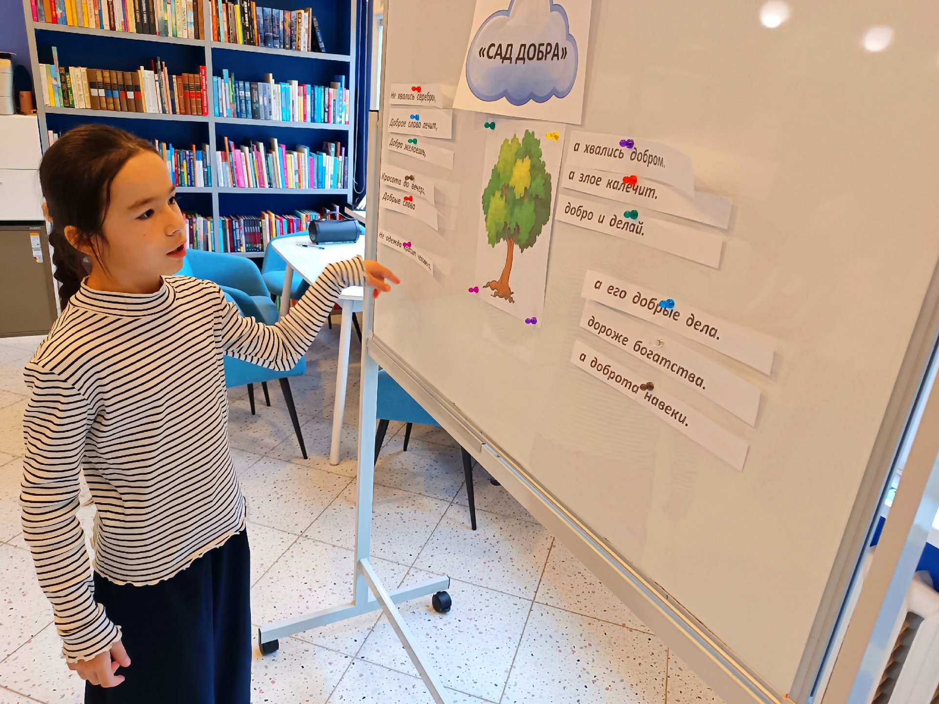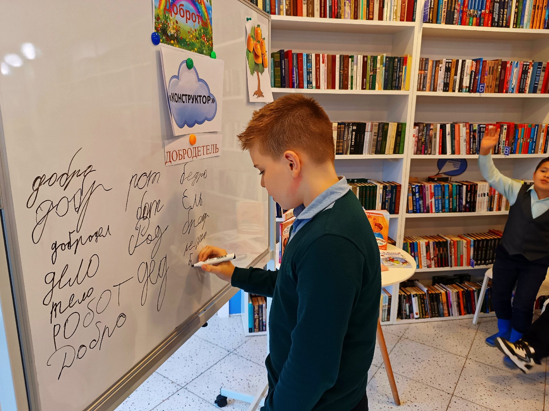 13 ноября мы отмечаем Всемирный день доброты! По этому случаю сегодня в Решоткинскую сельскую библиотеку им. Ю.П. Артюхина пришли ученики 4 «Р» класса школы «Развитие». Юные гости отправились в игровое путешествие в страну доброты. Во время пути они делали остановки на станциях: «Хорошие слова», «Сказочная доброта», «Угадай-ка», «Сад добра» и «Конструктор», где мальчишки и девчонки учились вежливости и комплиментам, знакомились со сказочными персонажами, отгадывали ребусы, вспоминали пословицы, подбирали антонимы и составляли новые слова, а из отдельных букв – общий девиз «ТВОРИ ДОБРО».