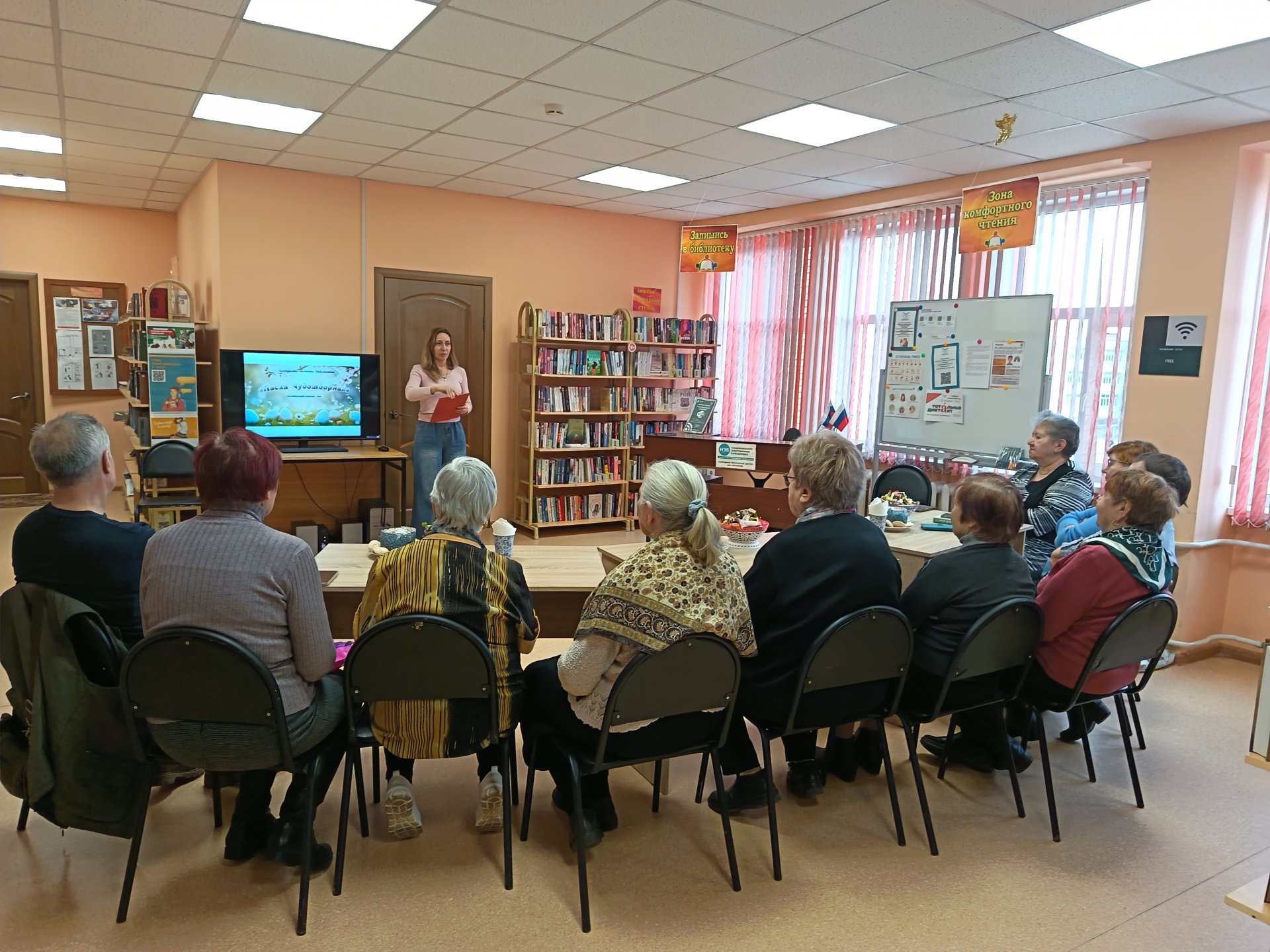 16 апреля в Слободской сельской библиотеке в рамках проекта «Активное долголетие» прошёл познавательный час «Пасха чудотворная», посвящённый одному из самых светлых и радостных праздников — Светлой Пасхе.
