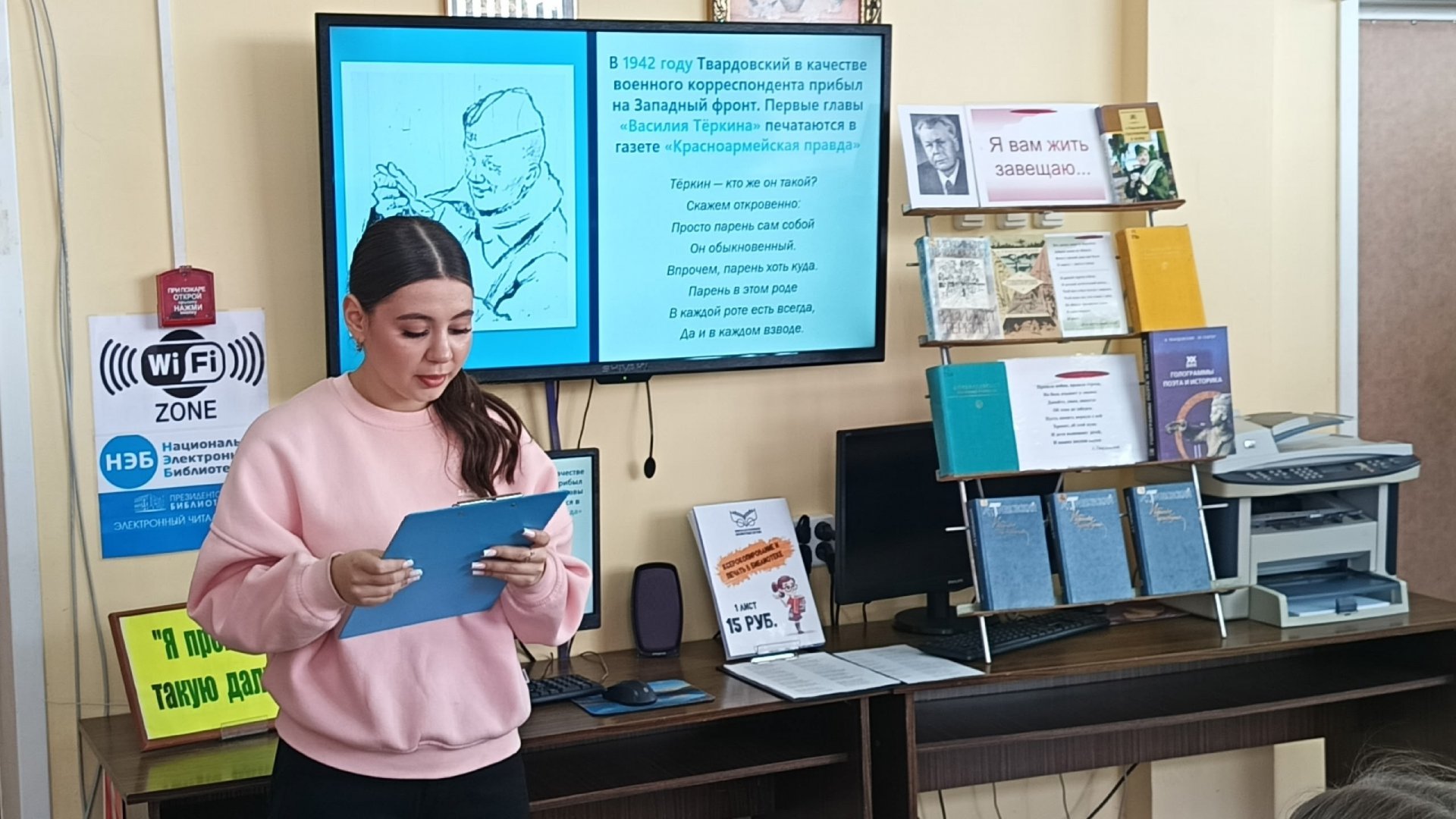 В начале встречи старшеклассники услышали рассказ о жизненном пути писателя и его творческом наследии. Особое внимание было уделено созданию поэмы «Василий Теркин», ставшей символом мужества, стойкости и оптимизма советского народа в годы Великой Отечественной войны.