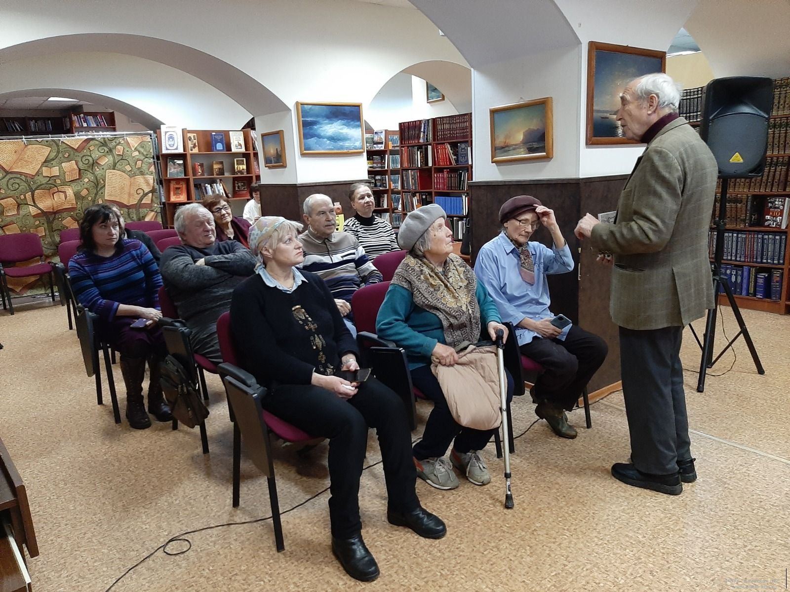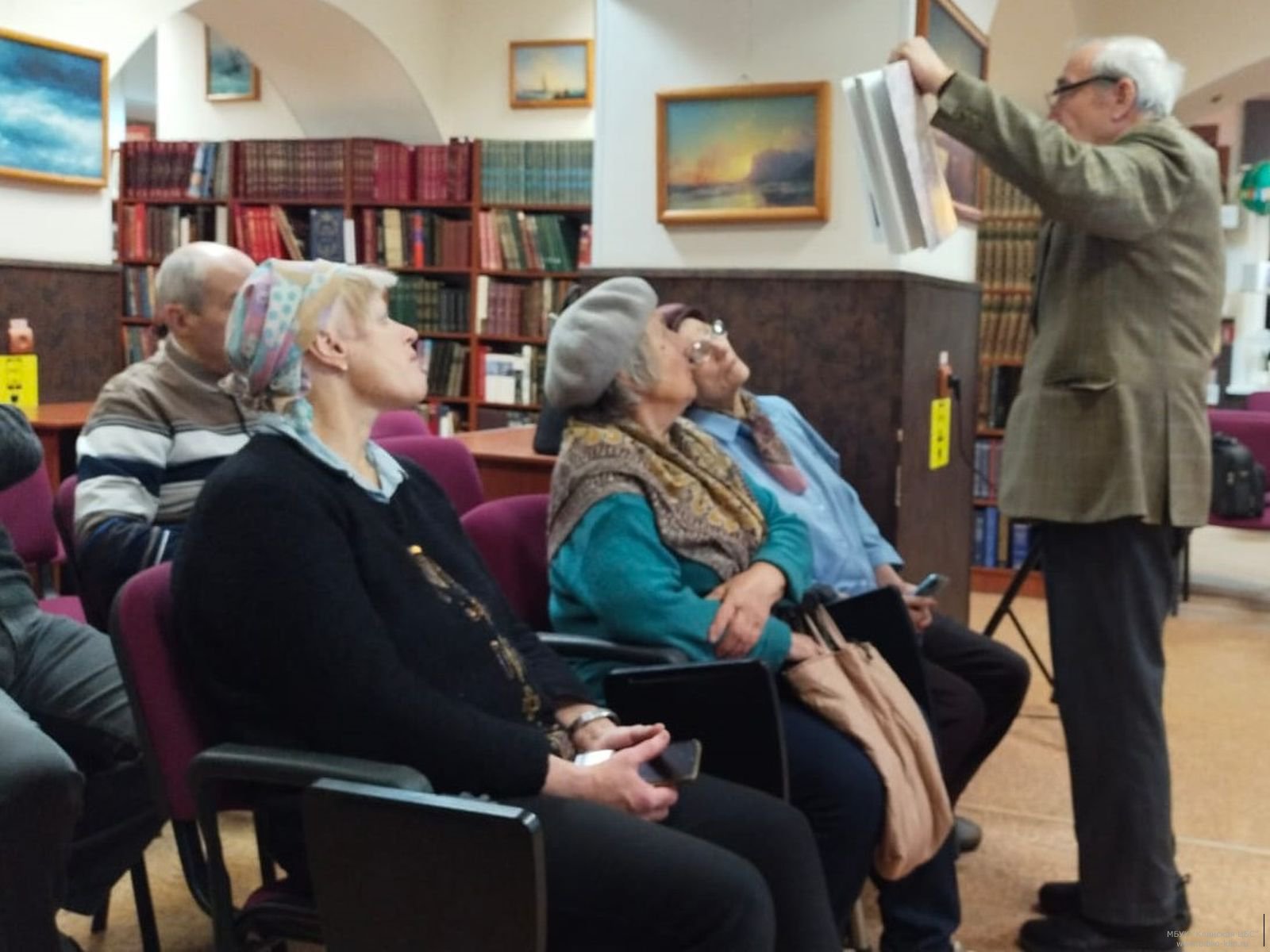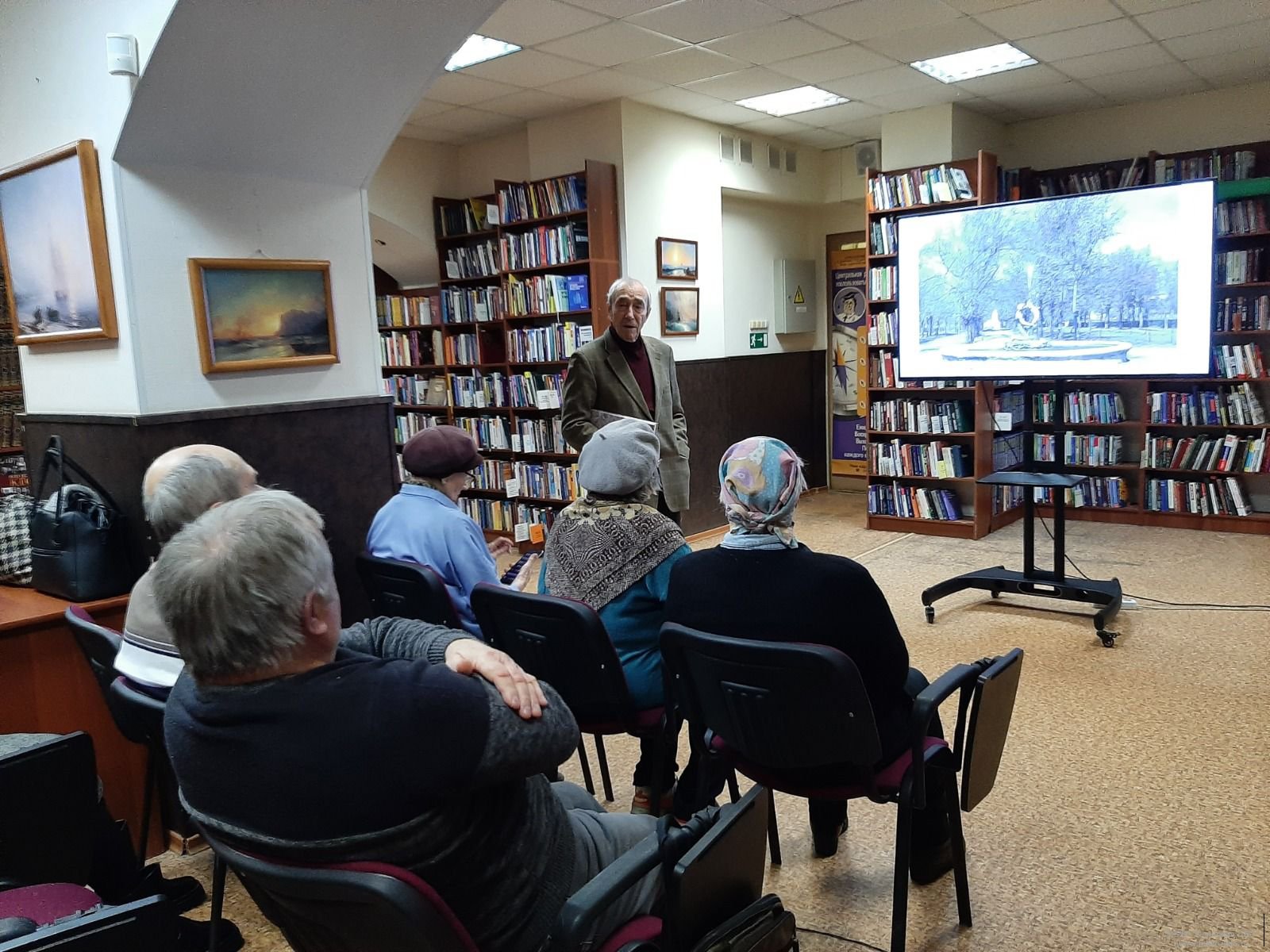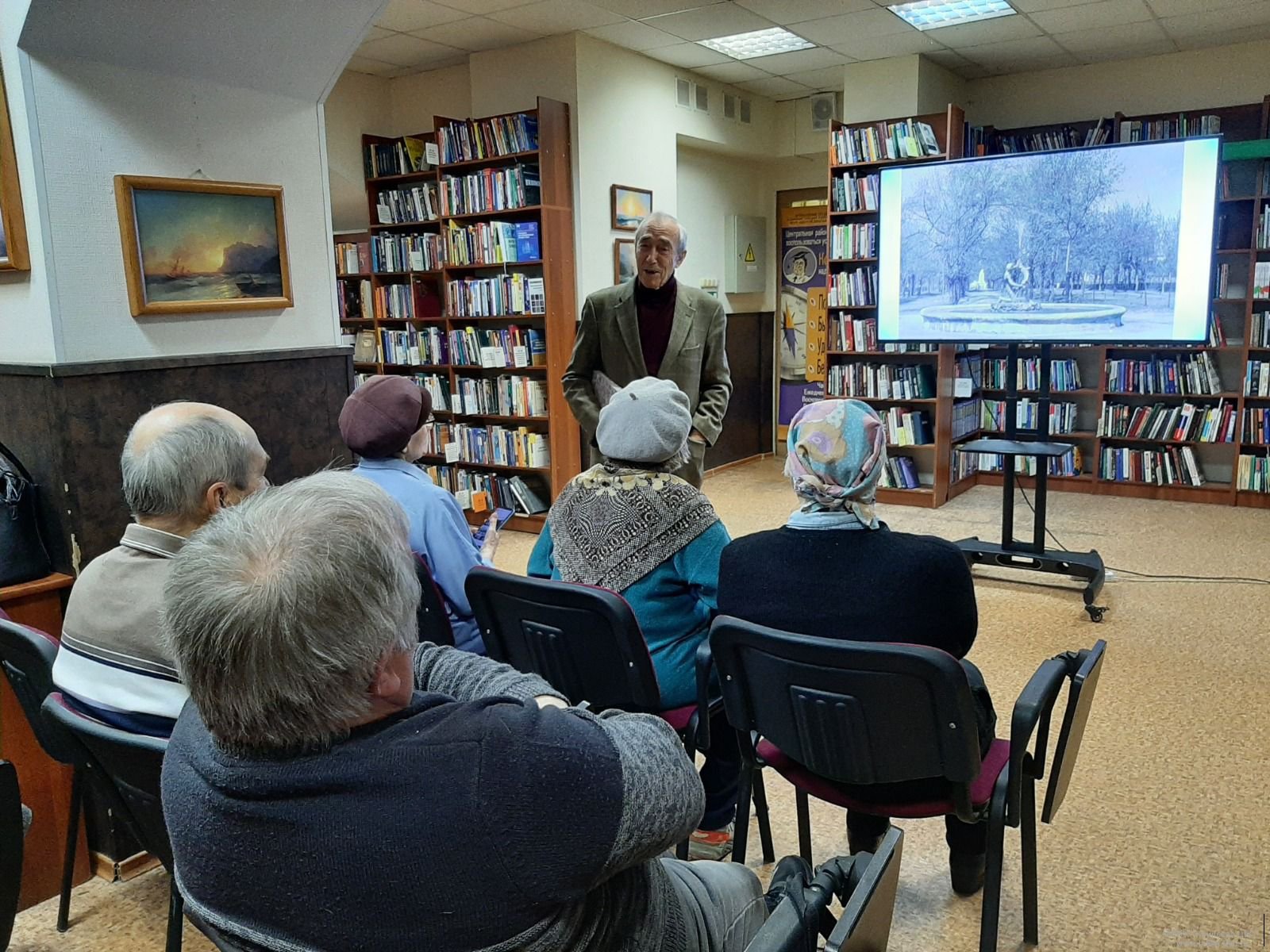 Клинский краевед, поэт и писатель В. М. Пернавский рассказал об истории создания сквера. Благодаря фотографиям разных лет можно было узнать, как проходили городские праздники на территории сквера. Присутствующие охотно делились своими воспоминаниями, именно здесь находилась танцплощадка – любимое место отдыха. В 1950-м году главным украшением Первомайского сквера стал фонтан «Рыбак и осётр». Не остались без внимания и памятники В. И. Ленину, К. Марксу. Рассказы Вячеслава Моисеевича дополняли участники мероприятия и выразили желание в продолжении таких краеведческих встреч в библиотеке.