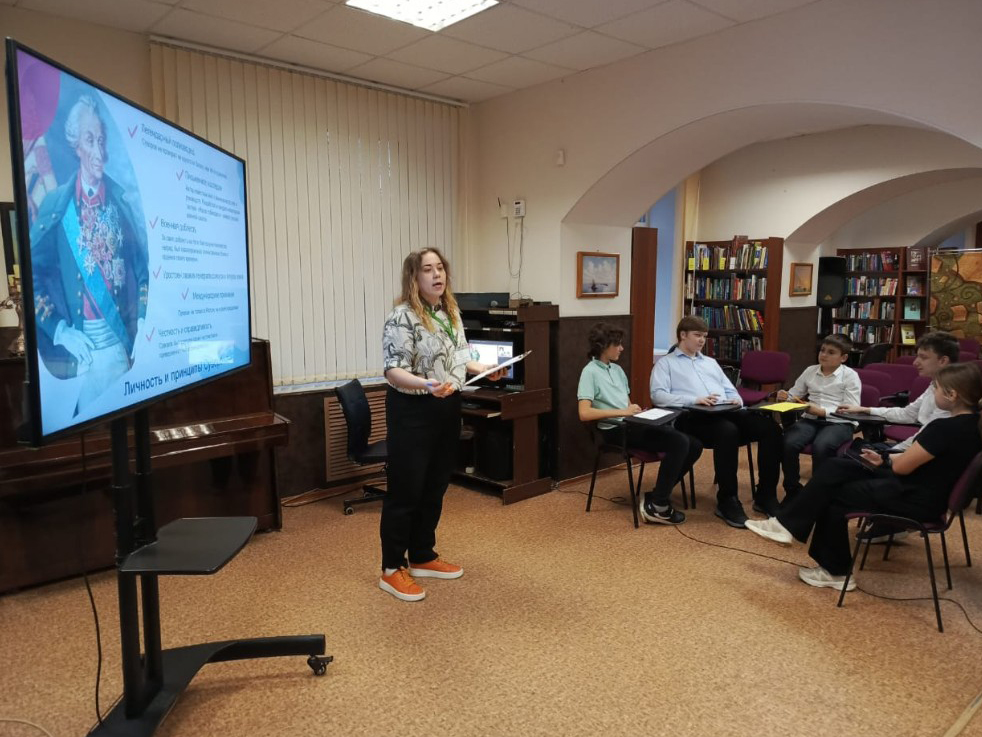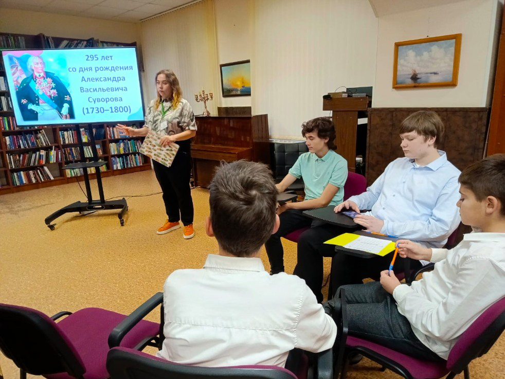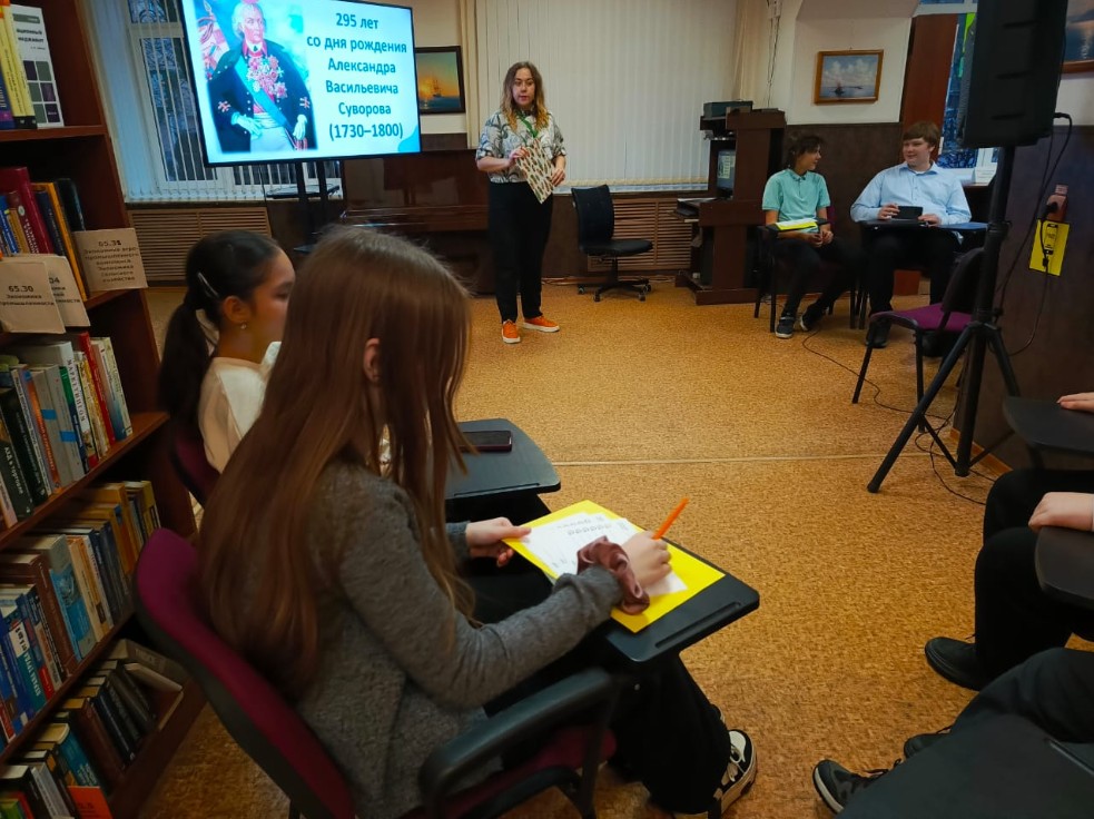 27 ноября в Центральной городской библиотеке прошла интерактивная программа «Сын Отечества – А.В. Суворов», приуроченная к 295-летию со дня рождения легендарного русского полководца, основоположника русской военной теории — Александра Васильевича Суворова. Учащиеся гимназии им. В. Н. Татищева погрузились в исторический экскурс и узнали о новаторской суворовской тактике, его легендарной «Науке побеждать», службе и подвигах, личностных качествах и жизненных принципах, которые актуальны до сих пор. На интерактивной игре команды проверили свою память, внимательность и смекалку, закрепив полученные знания.