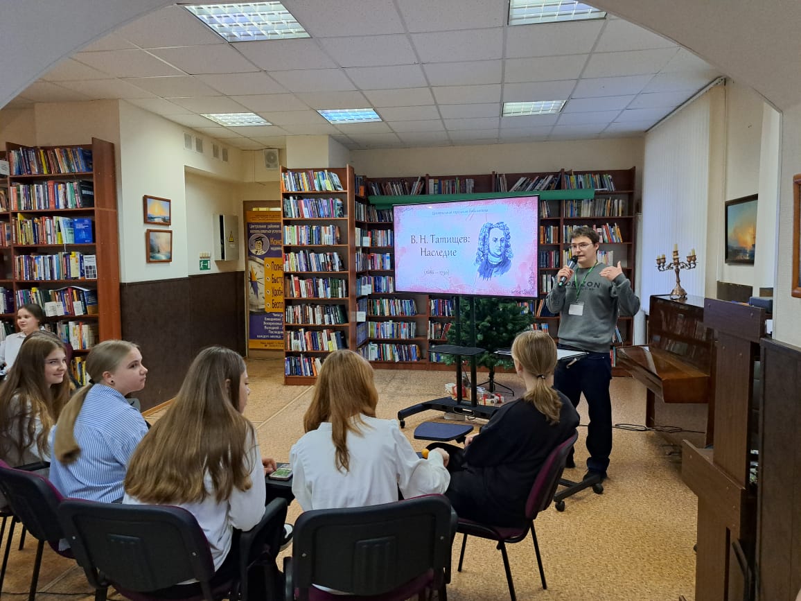 28 ноября в Центральной городской библиотеке для учащихся гимназии им. В. Н. Татищева прошёл краеведческий час, посвящённый наследию и «болдинскому» периоду жизни Василия Никитича. В ходе интерактивной программы гимназисты узнали, где жил и работал Татищев, какие забавные случаи происходили в его жизни, какие города он основал, в какие науки и сферы деятельности внёс неоценимый вклад, почему вёл исследования «о звере мамонте» и как его имя связано с Клинской землёй. Они с большим интересом посмотрели тематический видеоролик и в завершении встречи, разделившись на команды, приняли участие в викторине, с вопросами которой прекрасно справились.