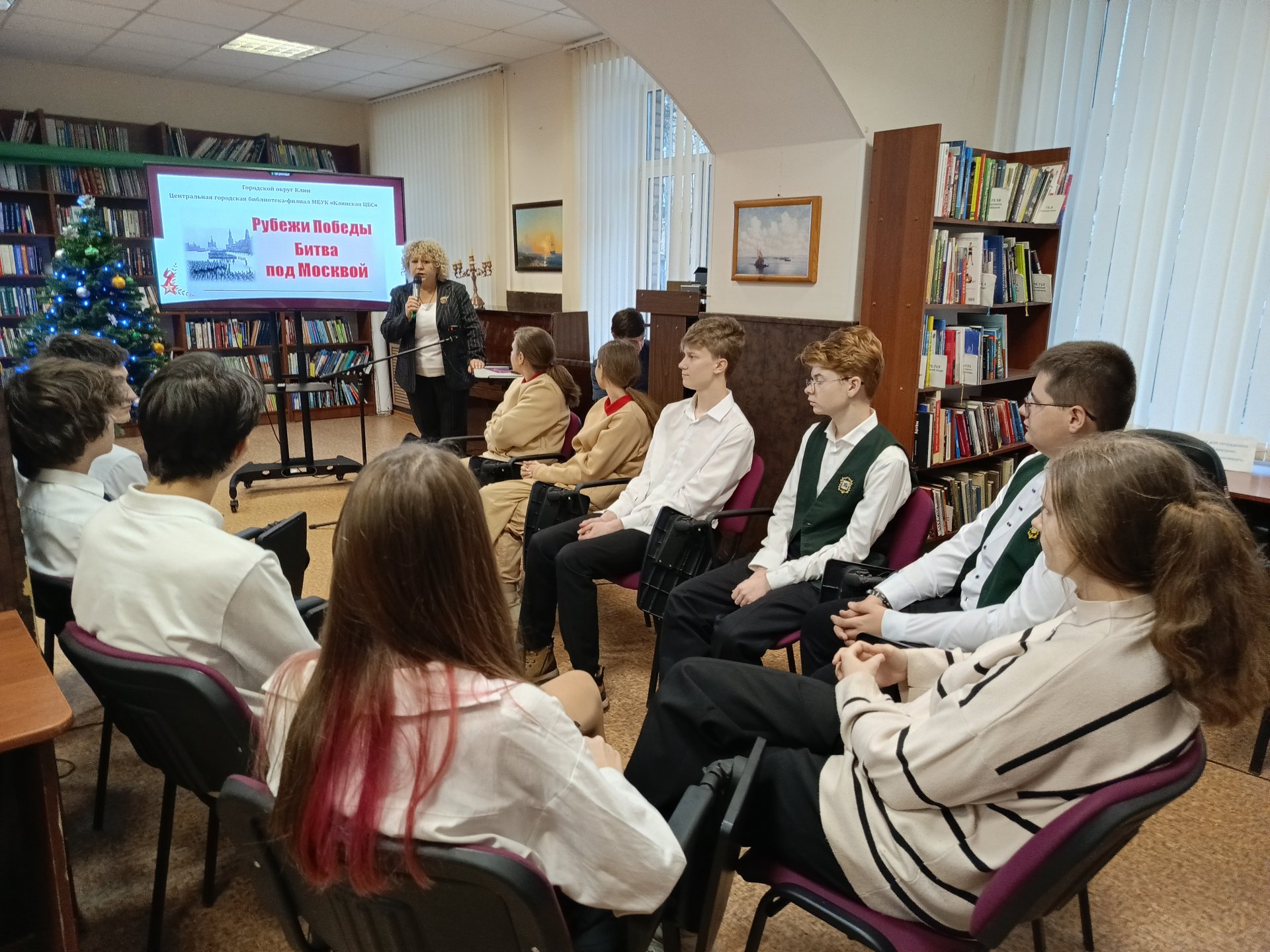 4 декабря Центральная городская библиотека провела краеведческий онлайн-турнир «Рубежи Победы. Битва под Москвой», посвященный героическим защитникам столицы в годы Великой Отечественной войны. Молодежная команда из школы им. Героя Советского Союза В. В. Талалихина г. Клин встречалась с командой читателей Клементьевской библиотеки — филиала Центральной библиотеки им. В. В. Розанова г. Сергиев Посад.