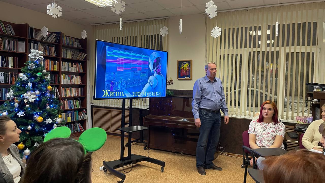 Приятным творческим подарком для зрителей стала презентация сотрудника библиотеки Романа Галкина. Он поделился своими стихами и представил авторские песни, аранжированные с помощью искусственного интеллекта. Эта необычная музыка создала в зале особенную, романтическую атмосферу.